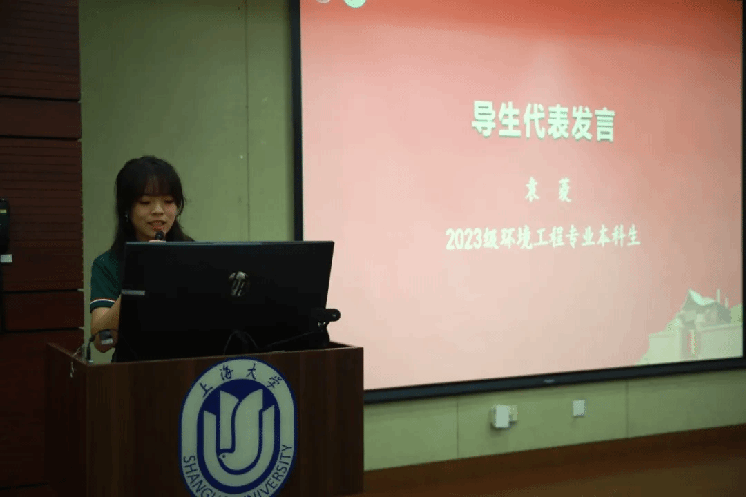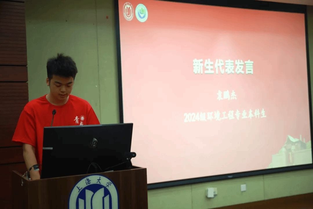 新生代表袁鹏杰同学表达了对大学生活的期待与憧憬,作为环境工程专业的学生,在生态文明事业中有必须肩负的责任和挑战。他希望能够快速融入大学校园,不断提升自我,并发扬学校的优良学风和校训精神,做有责任感和社会担当的上大人。