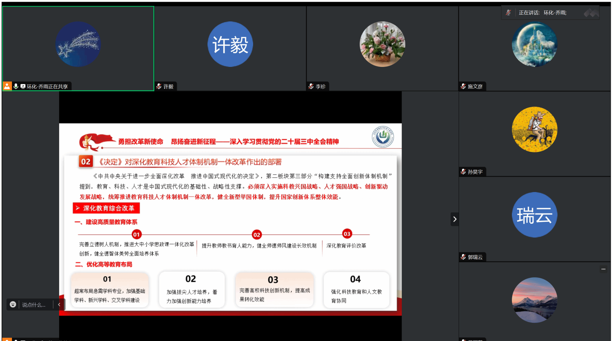 结合二十届三中全会精神、全国教育大会会议精神、习近平总书记近期关于生态文明建设的重要讲话精神、校第四次党代会精神等内容,钱冬英围绕“提高人才培养质量”“全力助推学科建设”“潜心科研创新”及“提升自身素质”四个方面,通过列举具体的工作实例与工作方法,向与会教师分析了新征程上应如何积极投身到改革实践中去,推动高校教育、科技、人才事业的蓬勃发展。钱冬英强调,全体党员要深入学习贯彻党的二十届三中全会精神,做到学用结合、知行合一,努力将学习成果转化为推动工作创新发展的强大动力,以更加饱满的热情、更加务实的作风,为学校高质量发展、为推进中国式现代化贡献自己的力量。