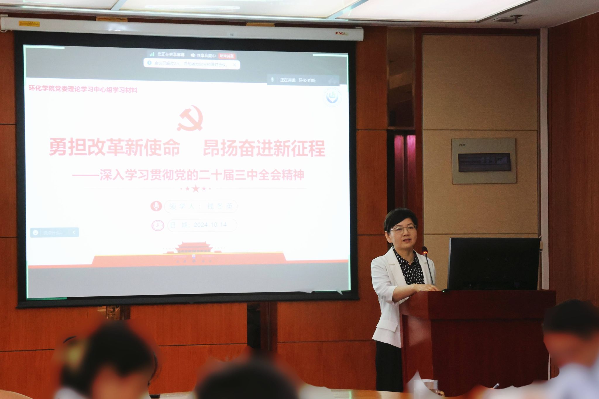 为深入学习贯彻党的二十届三中全会精神,推动引领学院党员全面理解和把握全会的精神实质和核心要义,激发广大党员的责任感和使命感,10月14日,我院党委在环化楼915会议室举办学习贯彻党的二十届三中全会精神专题党课。学院党委书记钱冬英以“勇担改革新使命,昂扬奋进新征程——深入学习贯彻党的二十届三中全会精神”为题,宣讲党的二十届三中全会精神,学院党政领导班子成员、各系所负责人、教师代表于线下参会,各党支部书记、支委等在线上同步参加学习。