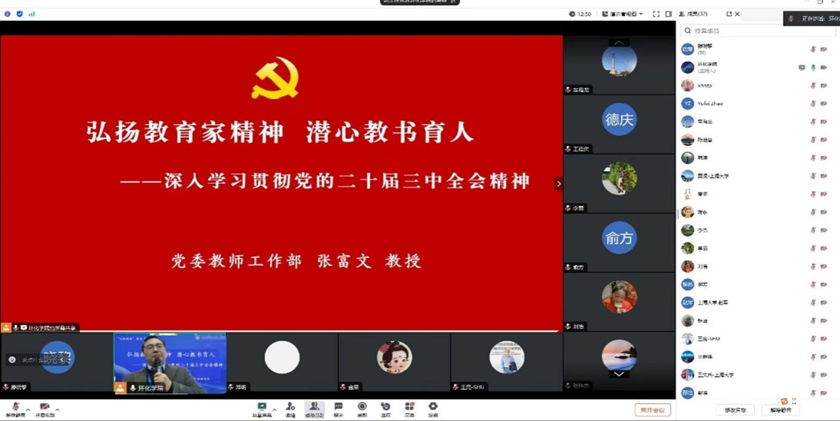 学院党委书记钱冬英代表学院对张富文副部长和辛明军主任的到来表示热烈的欢迎。张富文副部长以“弘扬教育家精神、潜心教书育人——深入学习贯彻党的二十届三中全会精神”为主题做专题辅导报告。他系统梳理了党的二十届三中全会公报及习近平总书记在全国教育大会上讲话精神,对《普通高等学校教师党建和思想政治工作质量标准(试行)》等文件政策进行了解读,并结合学校第四次党代会会议精神,围绕教育、科技、人才体制机制一体改革做了深入讲解。此外,他对相关师德师风警示案例进行分析,提醒广大教师要坚守师德底线,坚持言行雅正、廉洁从教、学术诚信,做好学生的领路人。