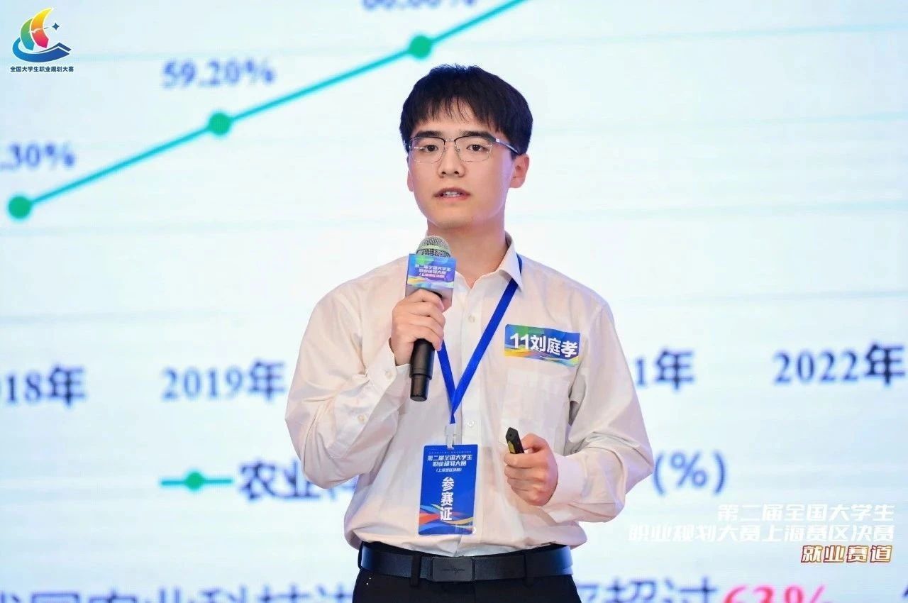 刘庭孝同学将目光投向农业经理人这一职业,怀揣着“促乡村沧桑巨变,绘山河美丽画卷”的梦想,参与废弃物资源化等多项课题项目研究,深入乡村一线调研,负责“教授农场”的运营管理,凭借丰富的实践经历和稳定的发挥,在就业赛道中斩获铜奖。