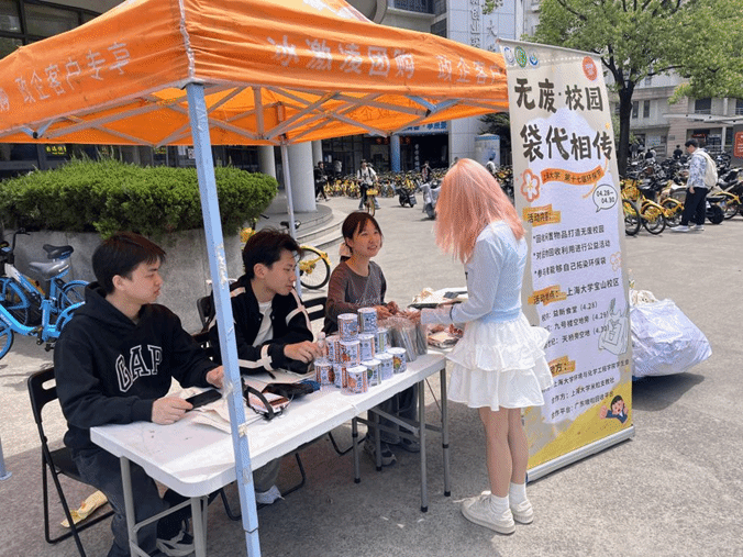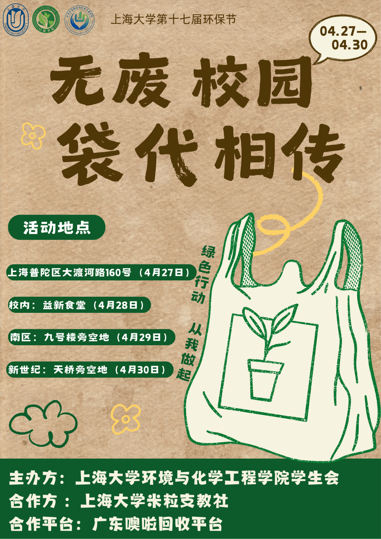 本届“无废校园·袋代相传”活动在大家的支持下,现已圆满落下帷幕。本次活动于4月27日、4月28日、4月29日、4月30日分别在上海普陀区大渡河路、校内益新食堂、南区宿舍、新世纪四个场地进行。