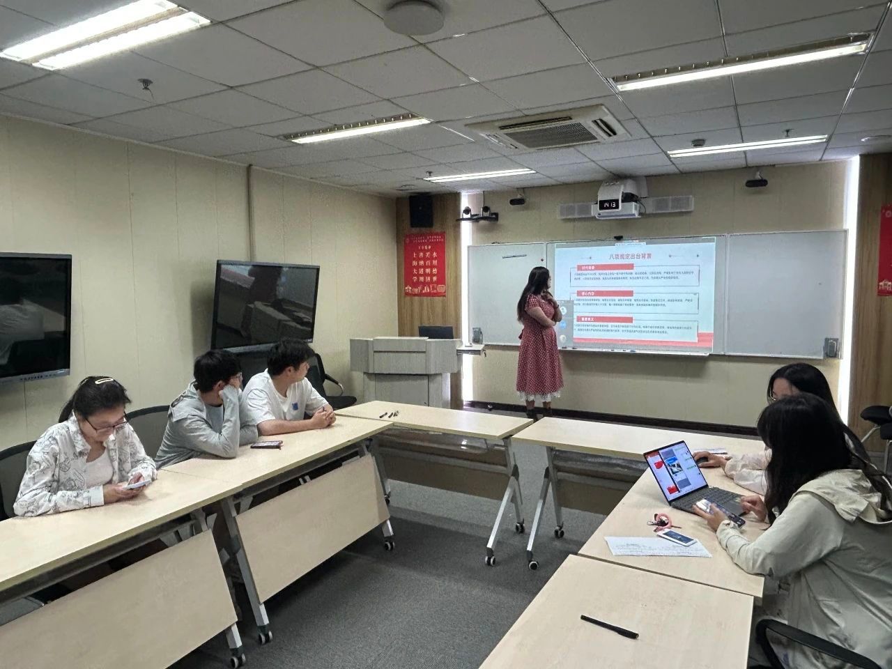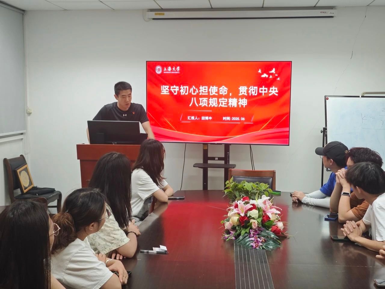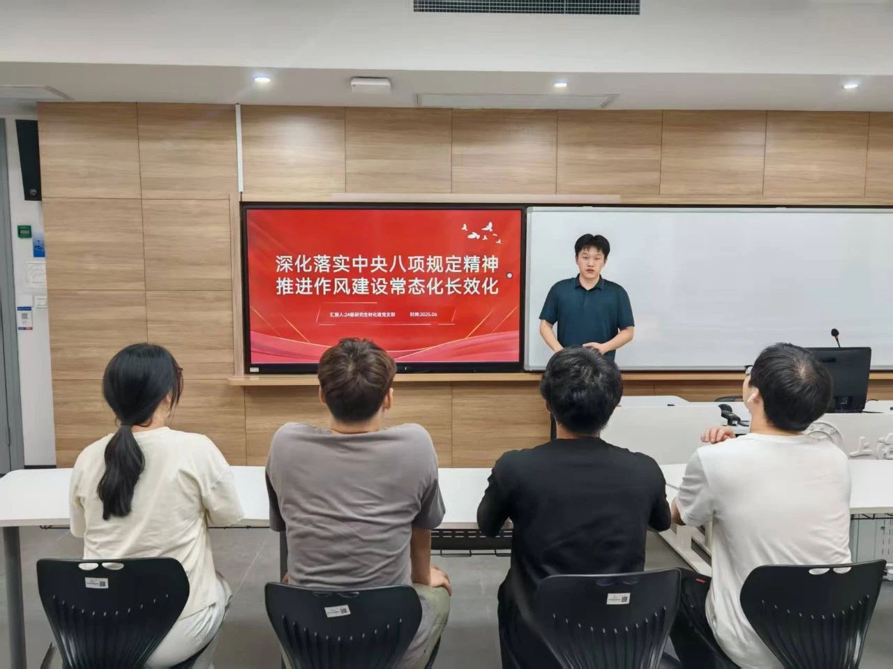 6月20日, 2024级博士班党支部组织开展“深学八项规定精神,筑牢作风建设根基”主题党日活动。党支部书记侯卫东首先讲解了《党的十八大以来深入贯彻中央八项规定精神的成效和经验》和《八项规定改变中国》。他指出,党的十八大以来,全党上下以中央八项规定精神破题开局,同“四风”顽疾开展了坚决斗争,党风政风焕然一新,赢得人民群众的广泛支持和信任。