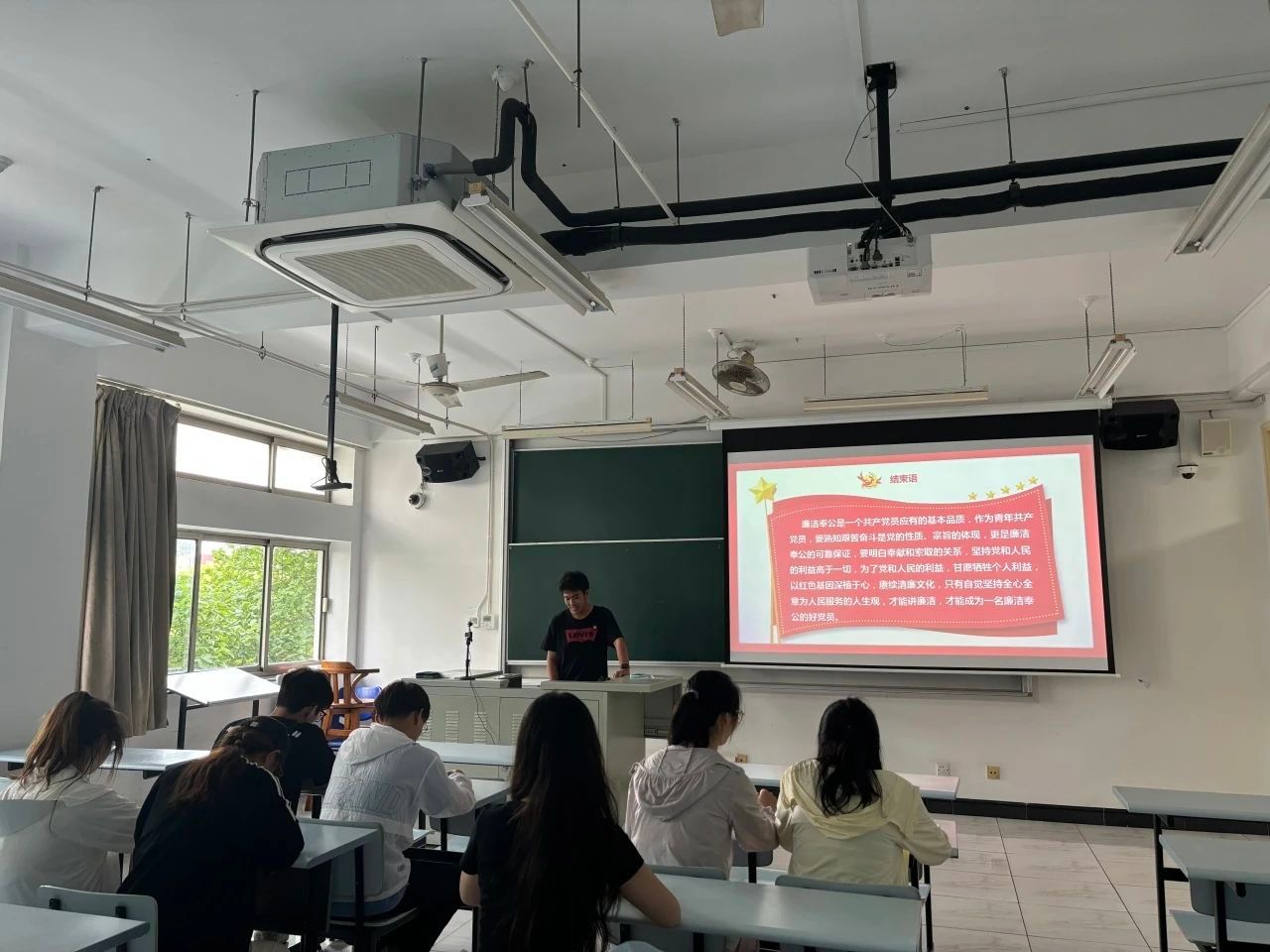 2023级研究生环境二班党支部于近日开展“八项规定映初心,作风建设永践行”专题党课。党支部书记周政屹结合实际案例,讲述中央八项规定的核心要义与深远影响。他强调,八项规定重塑了“为民、务实、清廉”的政治生态,如同永不生锈的螺丝钉,钉紧在全面从严治党的征程上,引领中国共产党以“永远在路上”的清醒,答好新时代的“作风考卷”。