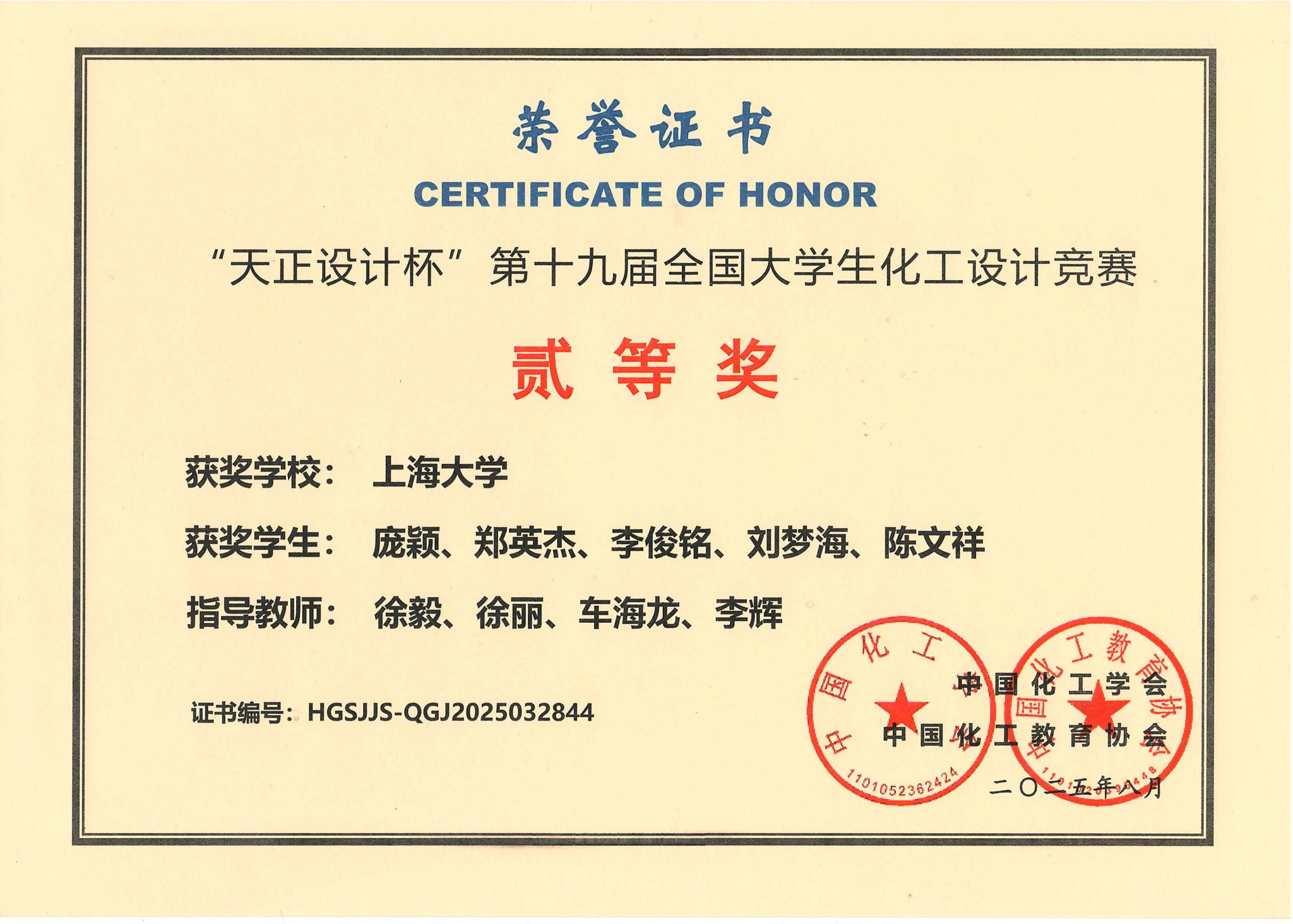 近日,“天正设计杯”第十九届全国大学生化工设计竞赛总决赛落下帷幕。本次竞赛吸引了全国479所高校的4337支团队报名,参赛人数首次超2万人,参赛学校和报名队伍的数量再创新高。由我院化学工程与工艺专业本科生庞颖、郑英杰、李俊铭、刘梦海、陈文祥五位同学组成的“钴锂全开”团队,凭借出色表现荣获全国贰等奖。此前,该团队在上海赛区和华东赛区连续斩获壹等奖。