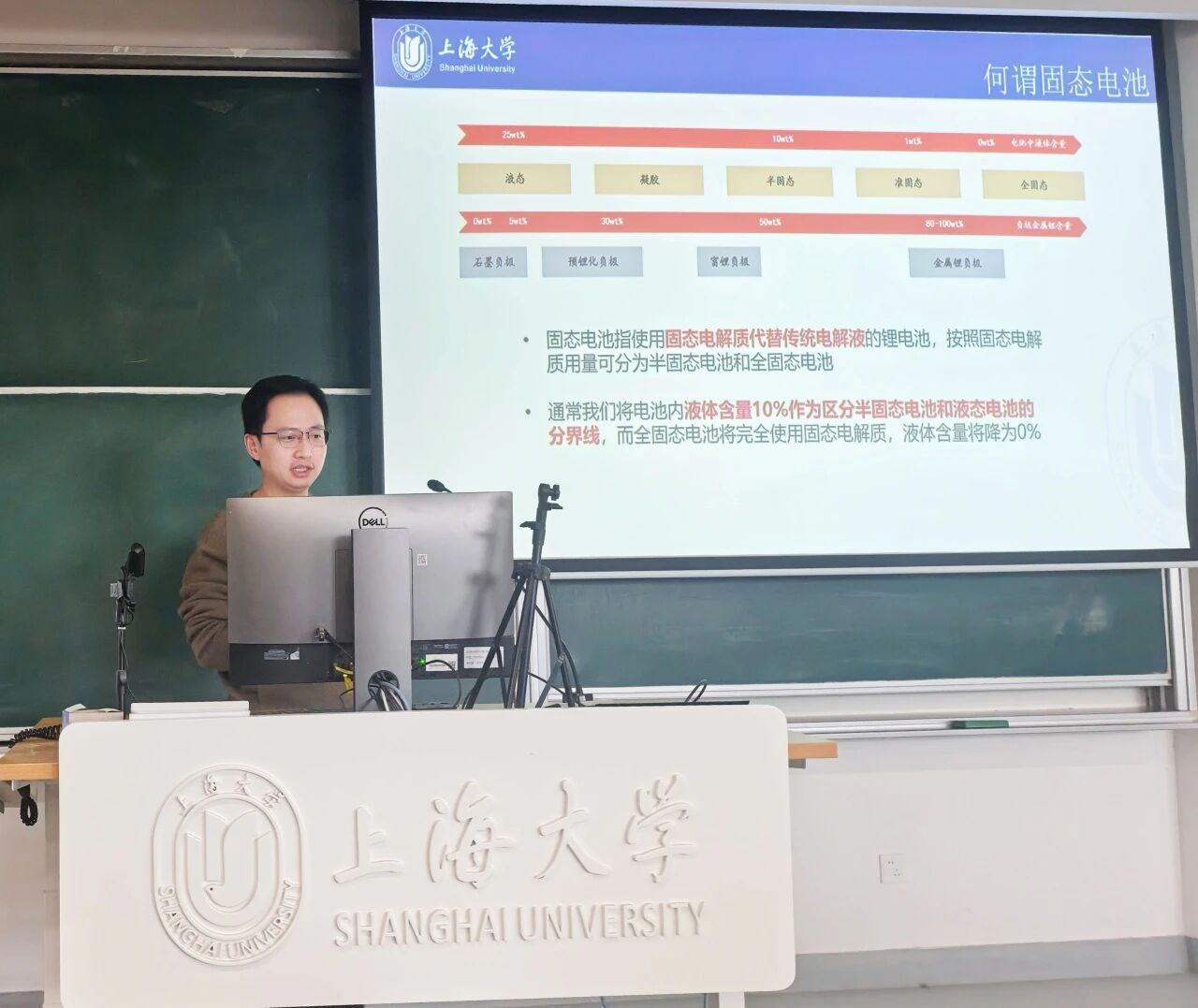 吴洋老师聚焦储能领域,详细讲解了锂离子电池的“摇椅电池”工作原理,对比了钴酸锂、磷酸铁锂、三元材料等主流正负极材料的性能差异。随后,他重点展望固态电池这一下一代技术,解析了聚合物、氧化物、硫化物三大技术路线的优劣,突出其无易燃电解液、能量密度超400Wh/kg的核心优势。结合国内外企业进展,吴老师介绍了宁德时代凝聚态电池、辉能科技海外工厂等产业化动态,让同学们清晰把握行业发展脉搏。