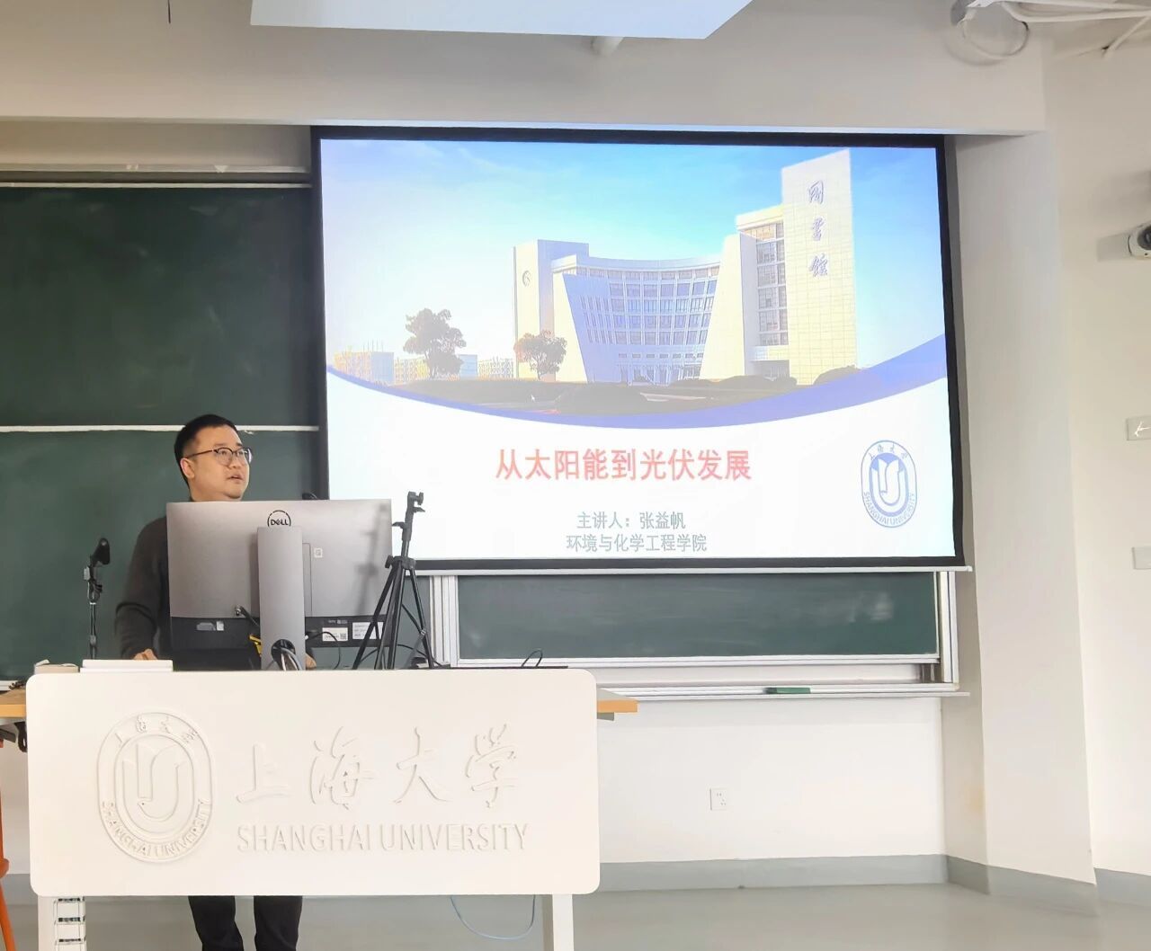 张益帆老师从太阳每秒照射地球相当于500万吨煤的能量数据切入,系统讲解了光热转换与光电转换的核心原理,对比了单晶硅、多晶硅、钙钛矿等材料的转换效率与成本优势。结合我国光伏装机容量全球第一的产业地位,张老师分享了光伏+储能系统的创新应用场景,从青海沙漠光伏厂到家庭分布式光伏设备,再到可穿戴光伏产品,让同学们全面了解光伏技术的产业落地现状与科研前沿方向。针对未来发展,他展示了光伏飞机、可穿戴光伏设备等创新方向,激发同学们的探索热情。