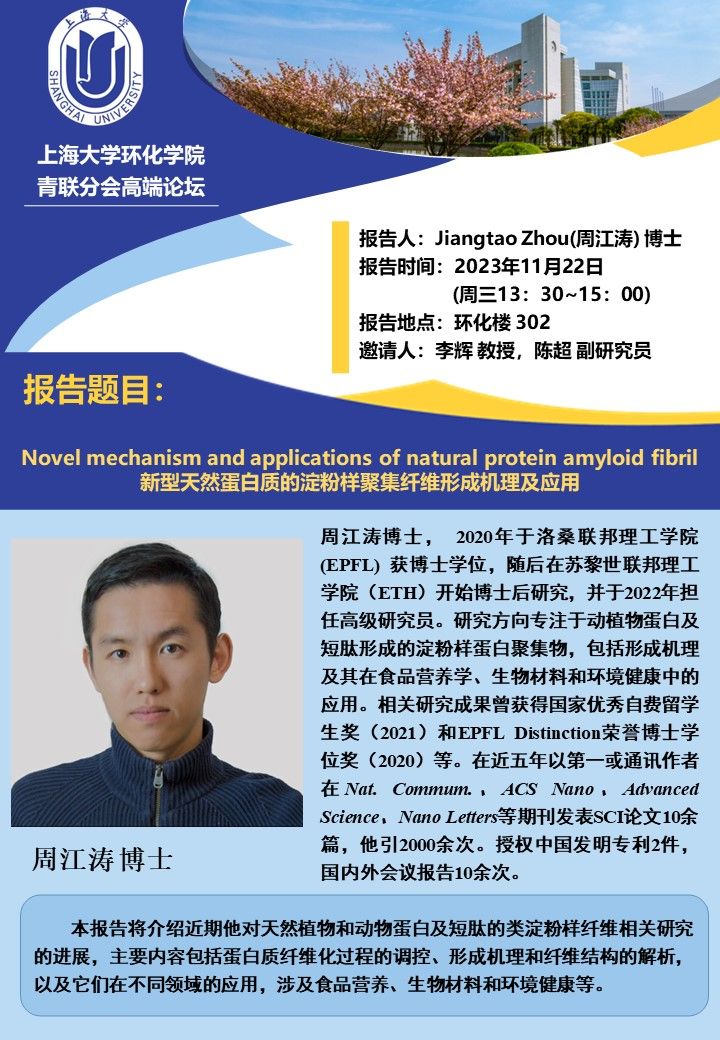 报告题目:Novel mechanism and applications of natural protein amyloid fibril(新型天然蛋白质的淀粉样聚集纤维形成机理及应用)