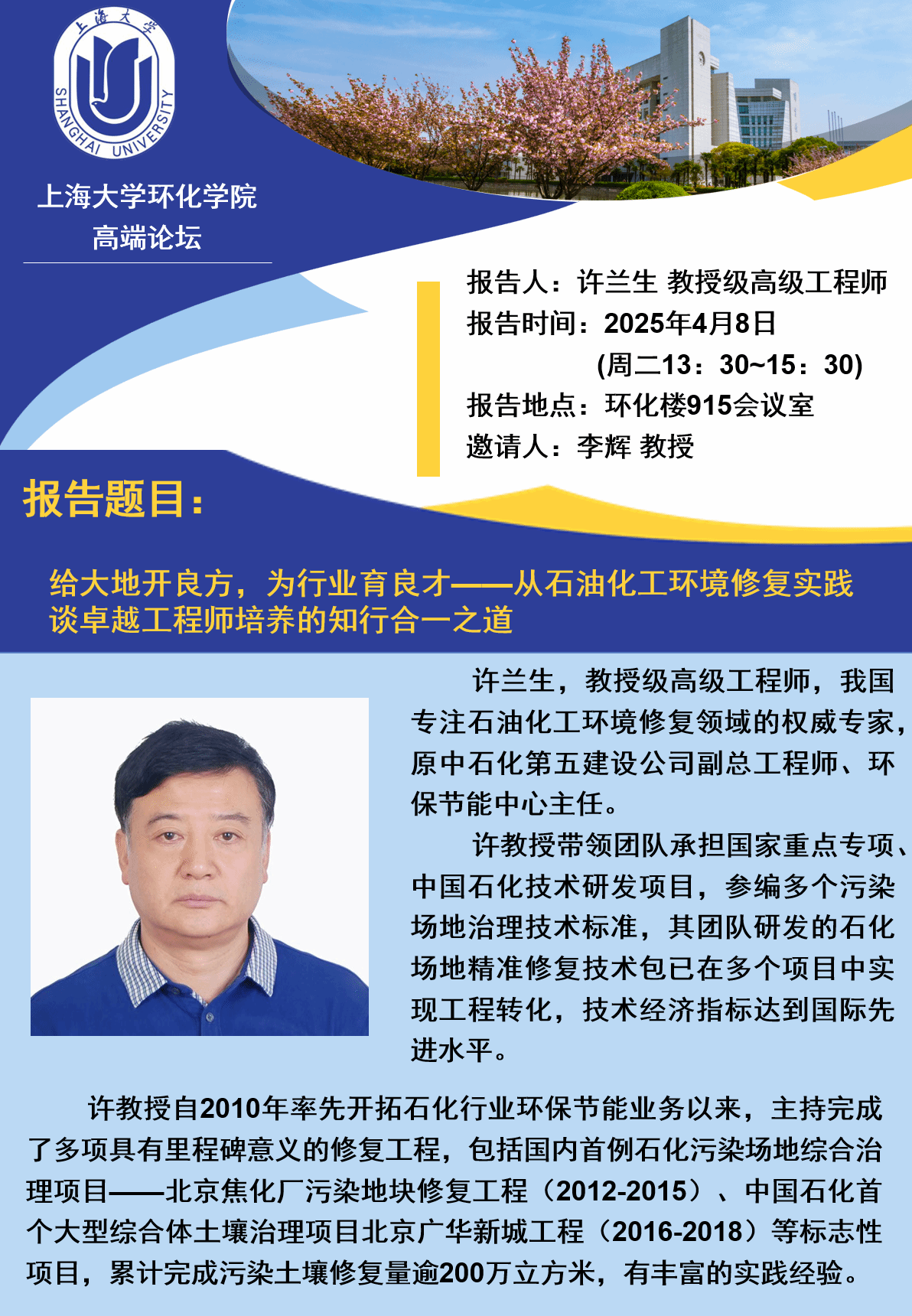 报告题目:给大地良方,为行业育良才——从石油化工环境修复实践谈卓越工程师培养的知行合一之道