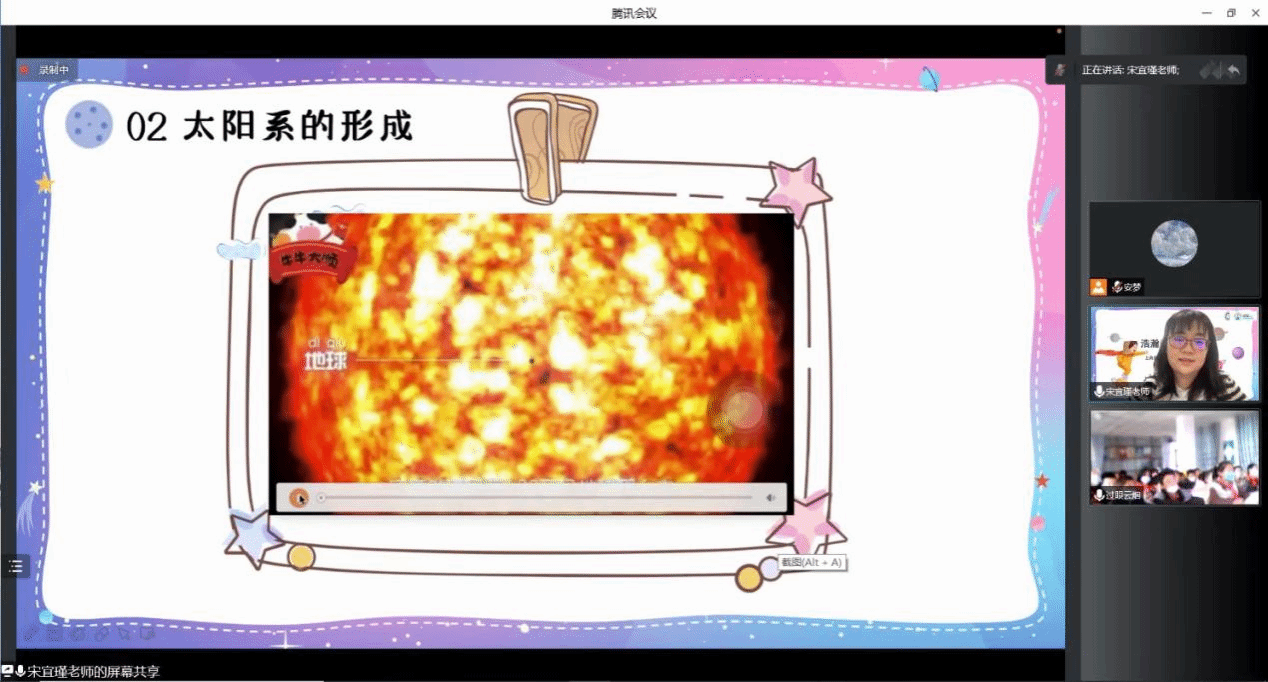 讲师宋宜瑾先是介绍康德和拉普拉斯星云说是最早的科学的天体演化学说,层层推进,由此慢慢展示出行星形成的过程,中途以提问的方式解释什么是星云和光年的单位,勾起孩子们对于行星的好奇。接着又生动形象的介绍了太阳系的形成过程,整个解释过程绘声绘色。该部分系统的介绍了完整的太阳系形成过程,从宏观角度揭示了整个太阳系,宇宙的探索也由此展开。