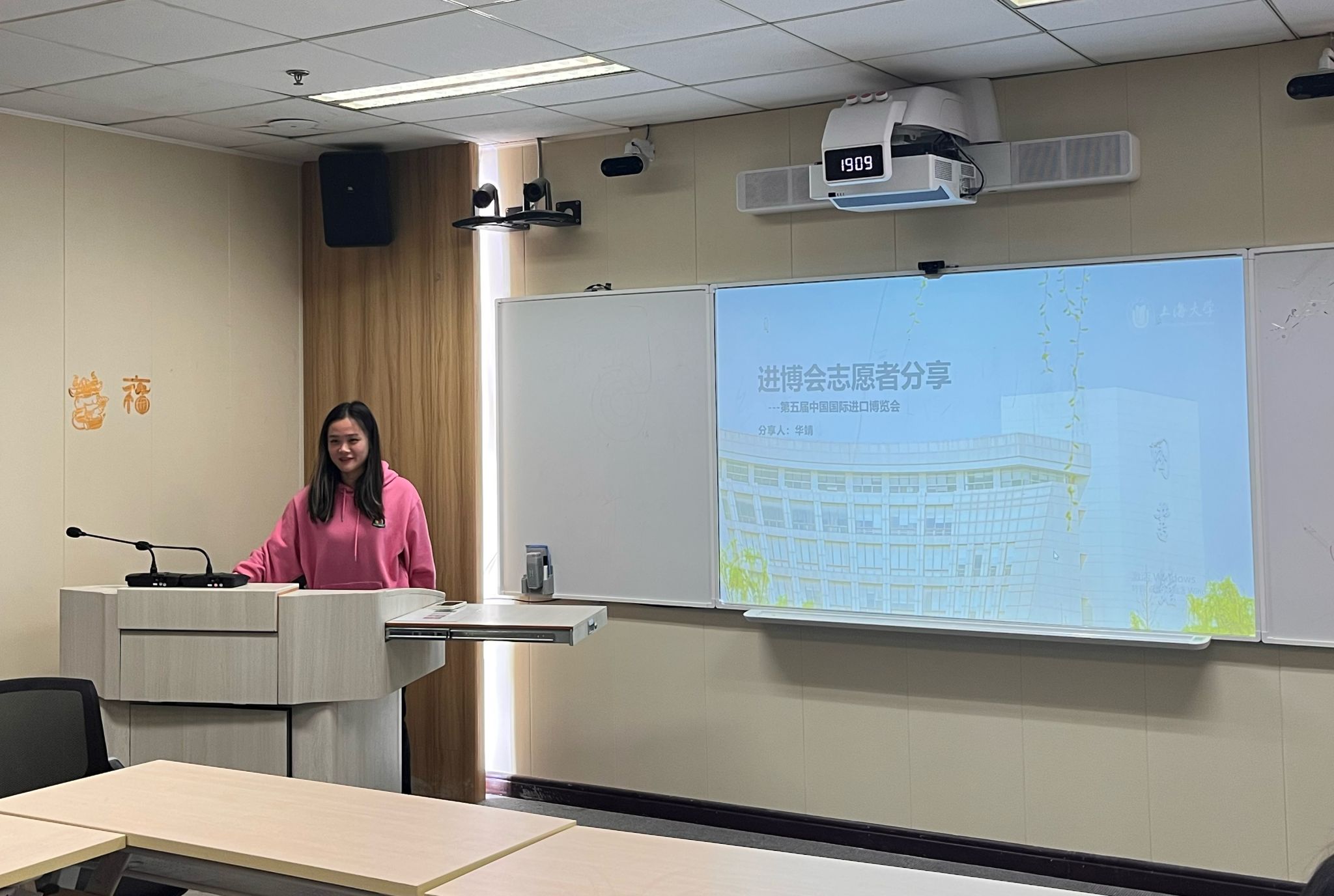 我们跟随华靖同学的镜头,一起沉浸式体验了进博会的精彩瞬间。她向大家展示了进博会的“四叶草”综合体展厅、进博会琳琅满目的展品还有进博会的吉祥物“进宝”。华靖表示,作为一名“小叶子”,在本次盛会中见证了祖国的强大,体验了各种前沿科技,收获了珍贵的友谊也锻炼了个人能力,与进博会共同成长。