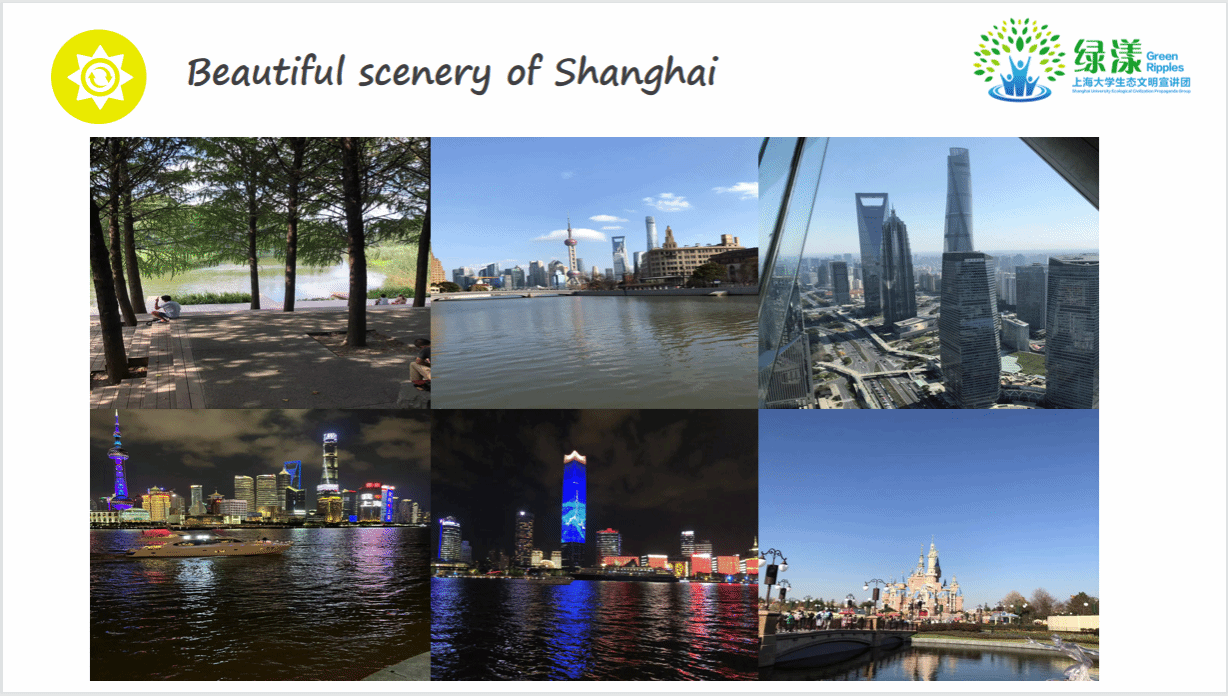 课程一开始,讲师孔繁一首先分享了几张上海的美丽风景图,唤醒了大家关于环境保护的意识。