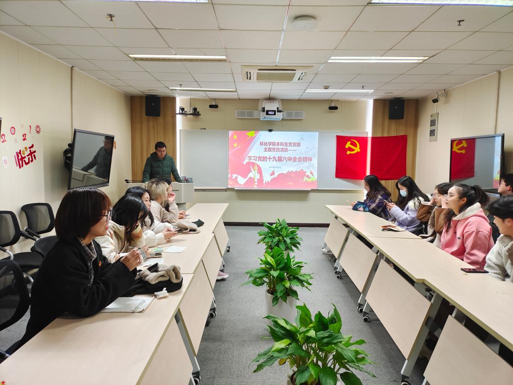 党的十九届六中全会是在实现第一个百年奋斗目标,开启实现第二个百年奋斗目标新征程的重要时间节点上召开的具有里程碑意义的会议。为深入系统学习领会全会精神的核心要义、丰富内涵和实践要求,引导学生党员从党的百年奋斗重大成就和历史经验中汲取智慧力量,弘扬伟大建党精神,矢志践行初心使命,环化学院本科生党支部于2021年12月30日下午开展“学习党的十九届六中全会精神”主题党日活动。