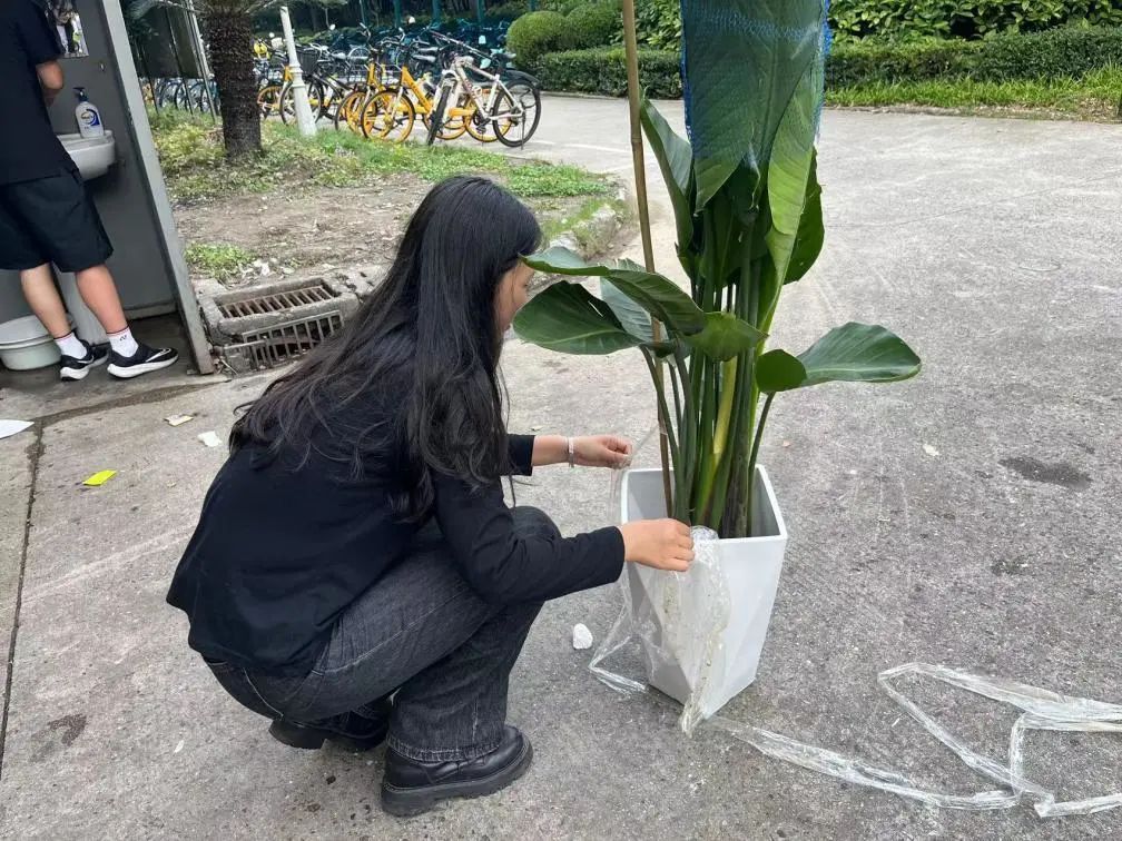 学生党员们除了清理地面垃圾,还引导前来投放垃圾的同学做到垃圾分类不落地,并且总结实施了系列简易可行的垃圾投放点美化方案。为了解决垃圾桶存放及美观卫生问题,他们使用绿植来营造出一种自然与垃圾分类投放点融为一体的和谐景象,用植物围蔽遮挡垃圾,美观的同时又绿色环保。
