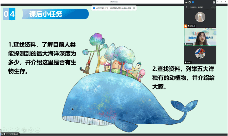 五大洋,全球水域的总称。旧分地球表面水域为五大区,称为五大洋。即太平洋、大西洋、印度洋、北冰洋和南冰洋。10月8日,陈芊妤讲师为王台中心小学的同学们云讲解了五大洋的知识。陈芊妤讲师首先讲解了五大洋的发现之旅,并且向同学们提出问题,引出五大洋的演化过程,为同学们播放视频,使同学们对大洋的演化过程理解的更加深刻,然后陈芊妤讲师讲解了五大洋的分布及其特点,紧接着同学们跟着讲师的步伐,开启了探寻海洋生物的足迹,最后陈芊妤讲师对本节课的内容进行了总结,来回顾本节课所学内容。在PPT讲解完成后,陈芊妤讲师对这节课所学内容,依次对同学们进行提问,虽然是在线上,但也能感受到同学们回答问题的积极,这也足以说明同学们听课的认真与投入。