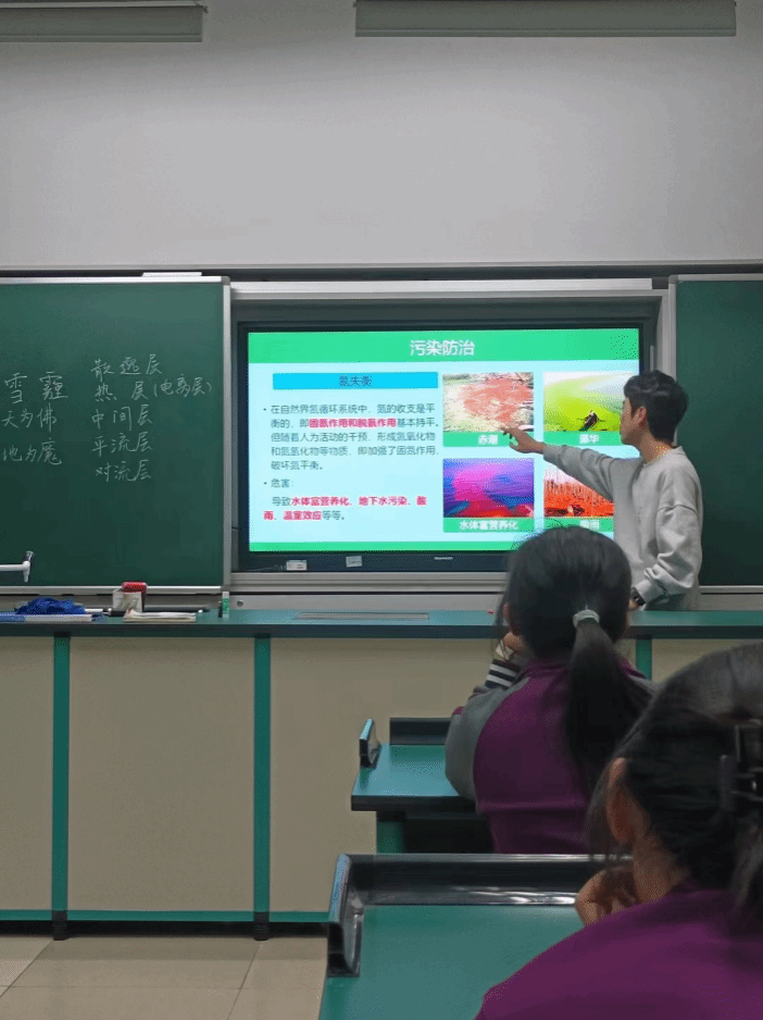 紧接着,曾炜达讲师以自然界的氮循环为例,首先讲解了自然界中氮的来源,并且播放视频,加深同学们的理解,然后讲解了氮循环过程中主要环节,最后讲解氮污染防治。课堂氛围十分和谐,同学们表现得十分活跃。