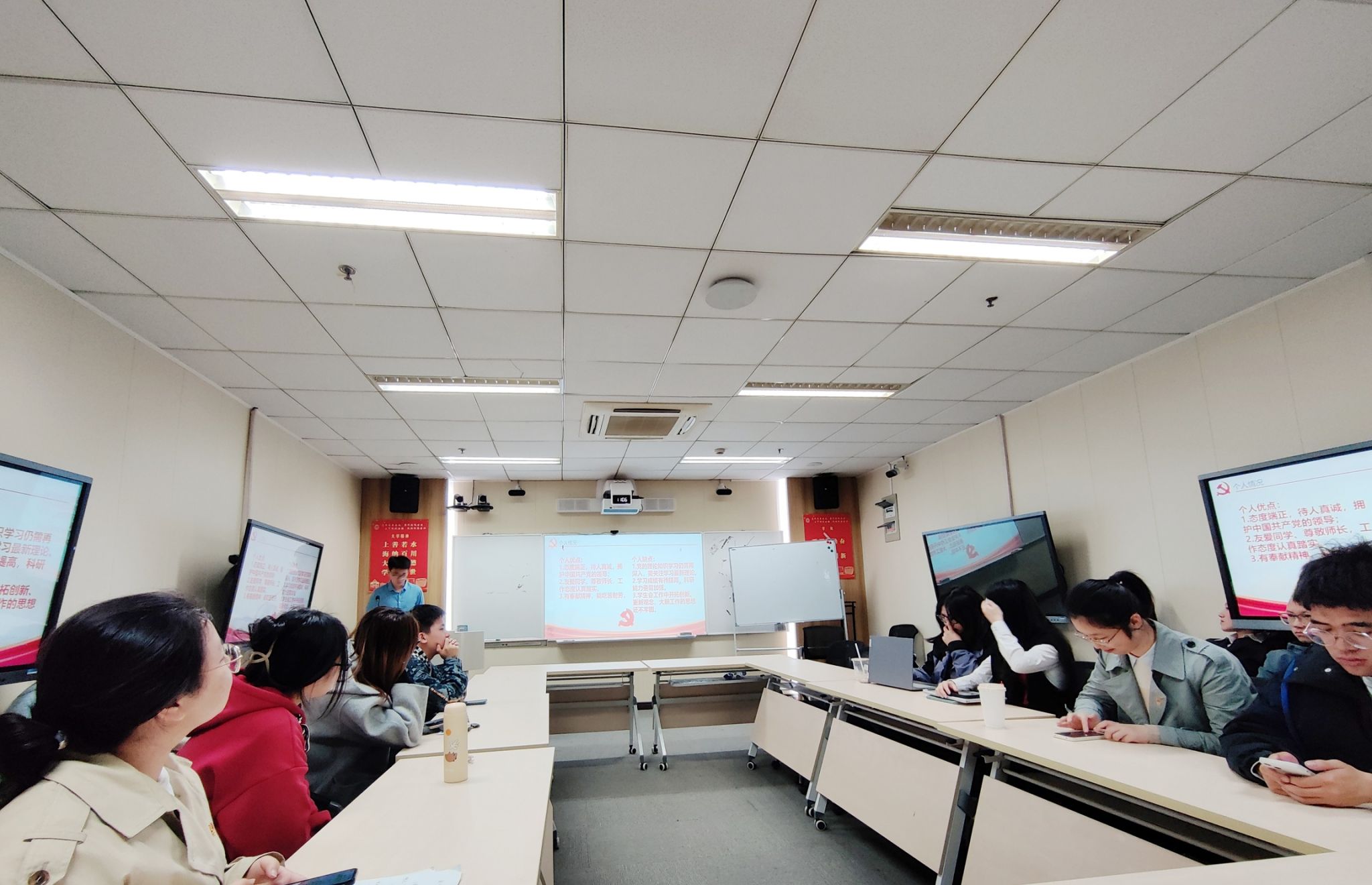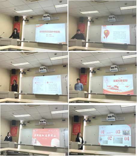朱启宽老师首先介绍了到场的各位评审,并宣读本次答辩会的主要流程、评判标准以及答辩相关注意事项。参与答辩的张嘉慧等同学依次介绍个人基本情况,重点阐述入党动机、对党的认识、在学习和工作中发挥先锋模范作用情况以及自身存在的不足和今后努力的方向。评审团根据答辩内容,从党的理论知识、个人如何发挥先锋模范作用以及日常工作表现等多角度进行现场考核,并提出建议。现场观摩学习的学生观察团积极踊跃向候选人请教经验,确立今后努力方向。