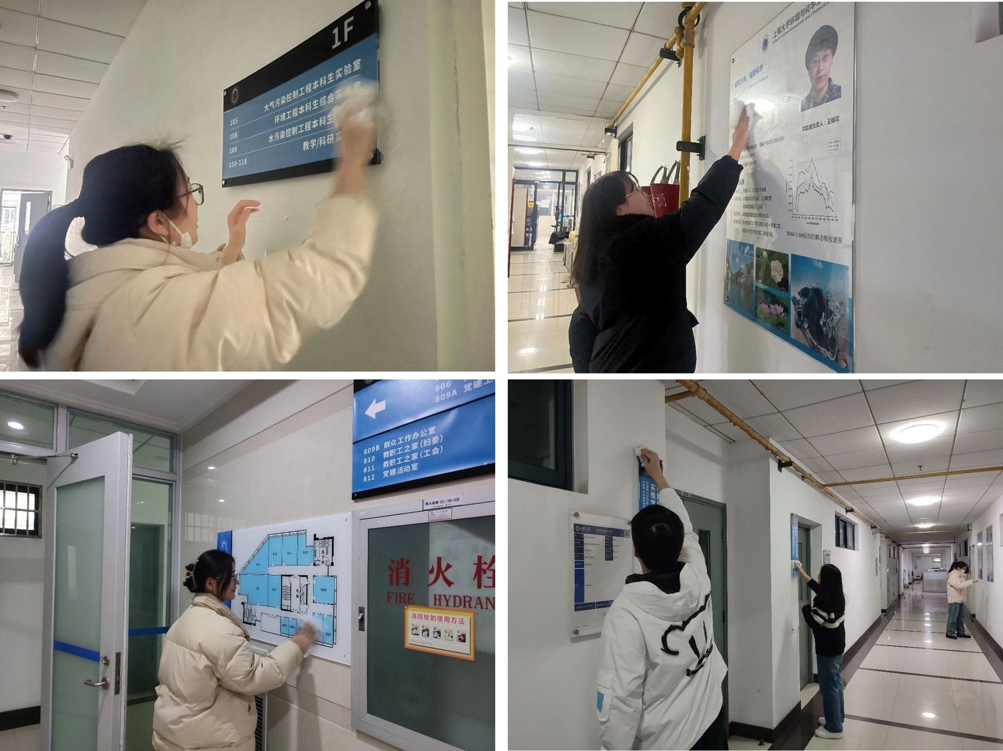 楼道走廊区域展示有各个系所以及各位老师研究方向,组织志愿者对1-9楼展板进行擦拭,美化楼内环境。