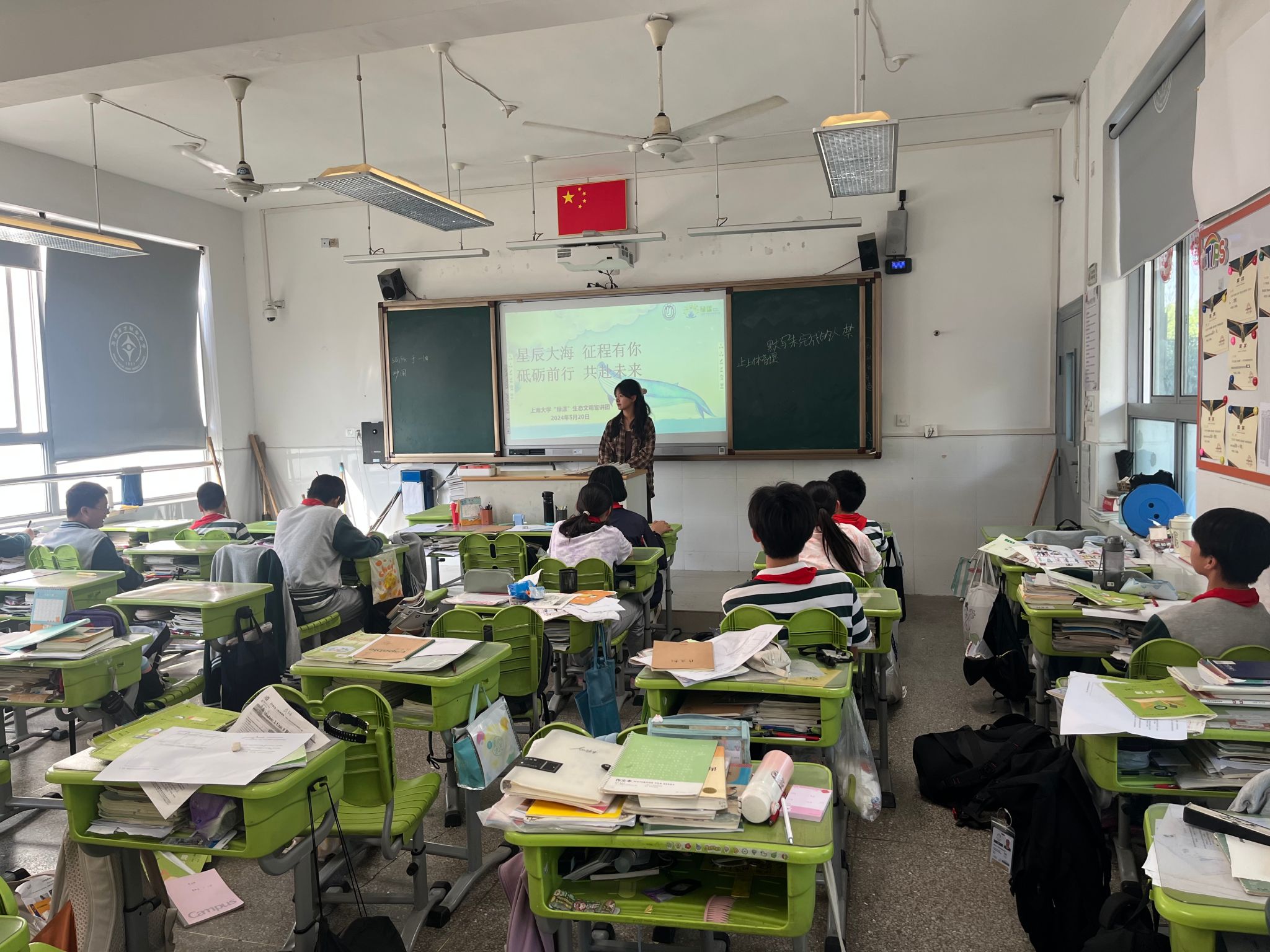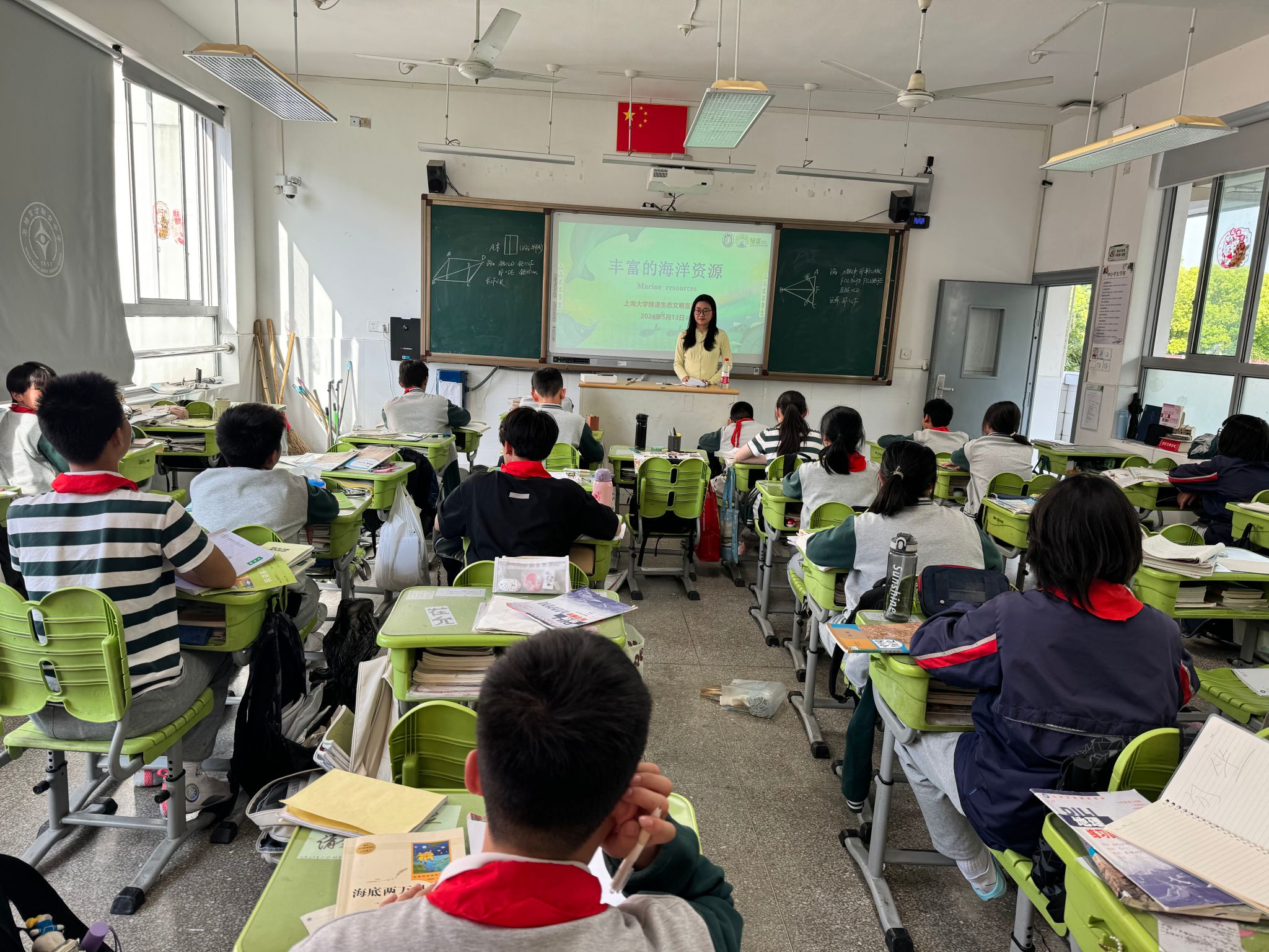 黄悦:2024年5月20日,我作为“绿漾”宣讲团的讲师,来到马陆育才联合中学宣讲,宣讲的主题为“海洋的资源化利用”。宣讲开始前我的内心很忐忑,但是站在讲台上后,同学们积极与热情的回答给了我很大的动力,课堂的互动效果很好。这次宣讲向同学们普及的知识是“海洋能源及其利用”,希望借此拓展同学们多方面的知识。