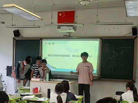 课堂尾声,唐文虎讲师通过提出问题和播放视频引导同学们互相讨论,启发同学们思考人类与海洋的关系以及行动保护措施,让同学们意识到海洋与我们的生活息息相关,我们要将保护海洋的种子深埋于心,付诸行动。同学们在课堂上展现出极大的积极性,他们踊跃发言、热烈讨论,这种积极的讨论氛围不仅有助于加深大家对知识的理解,也能够激发出更多的创新和思考。