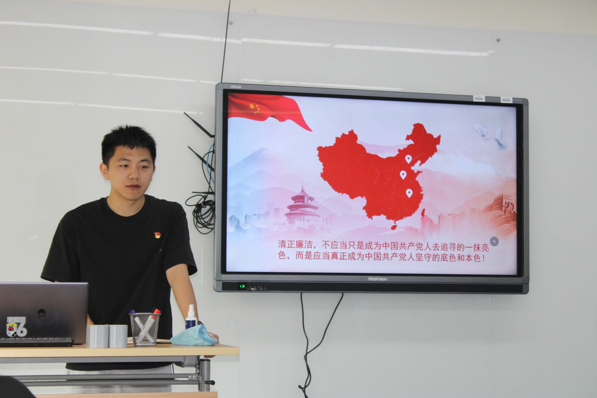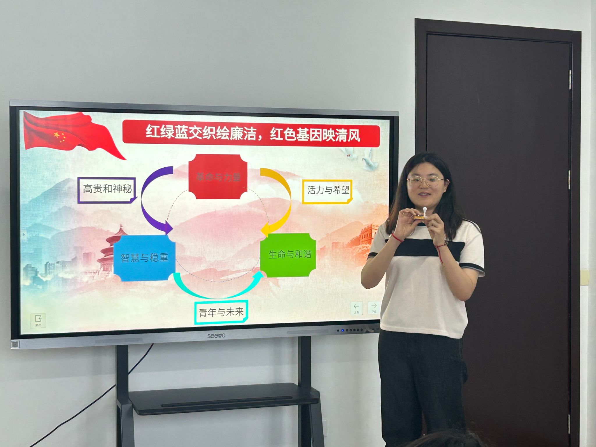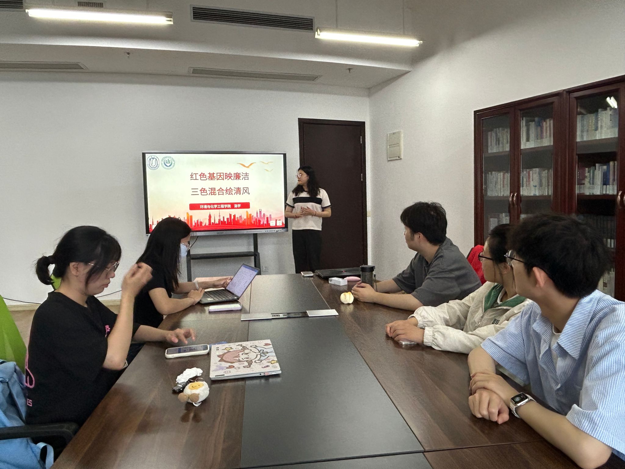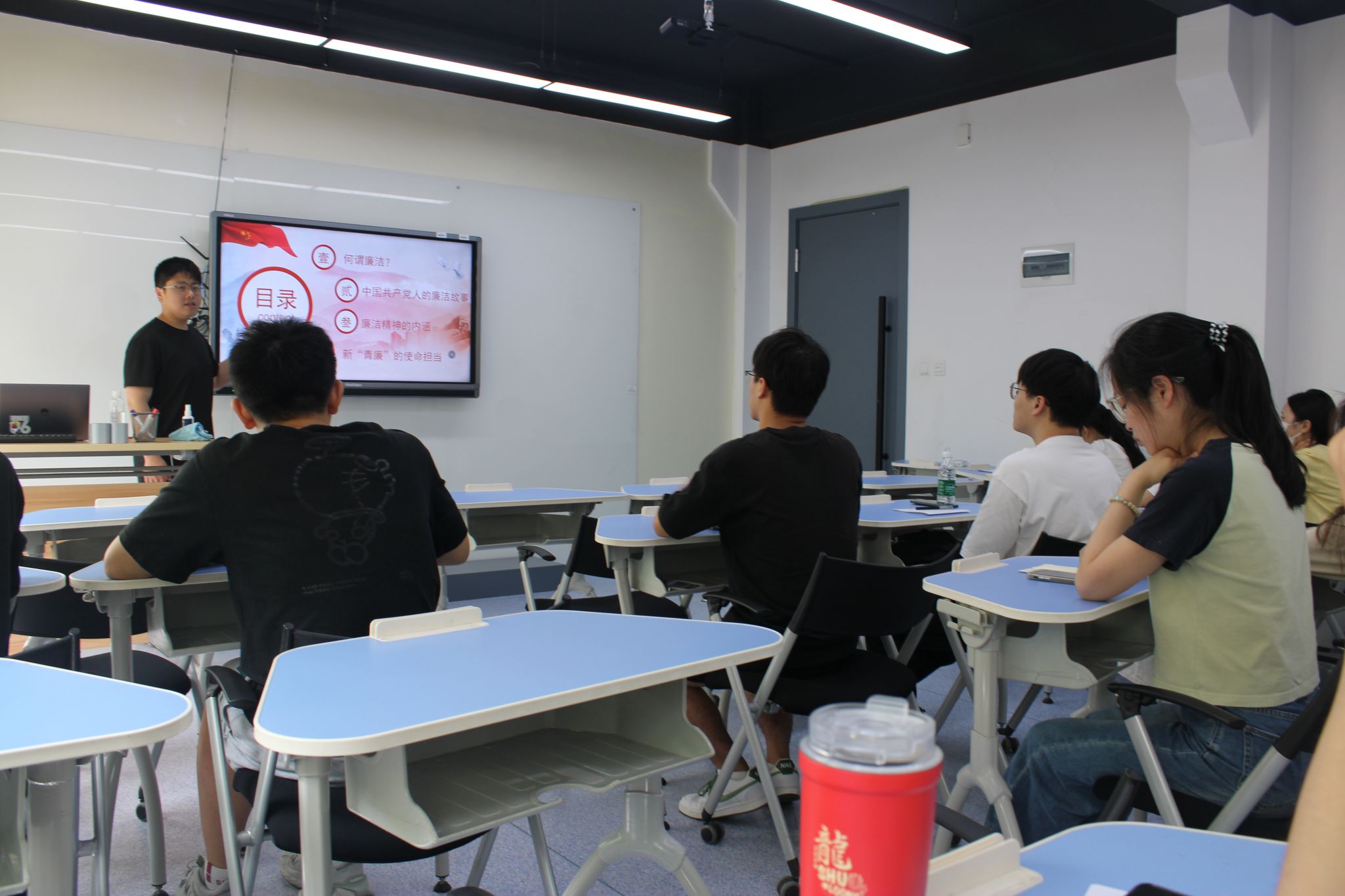 2023级研究生环境一班党支部书记洛宇讲述李大钊三代人一脉相承的廉洁家风,强调红色基因和廉洁清风是相互包含、相互成就的关系。为了进一步阐述这种理念,洛宇巧妙地借助了“红、绿、蓝”三原色来作为比喻,并通过光学实验告诉我们作为新时代的青年党员要调好这个“三色盘”,坚持高线守住底线,始终保持清正廉洁的政治本色。