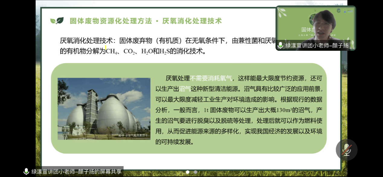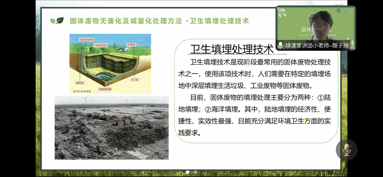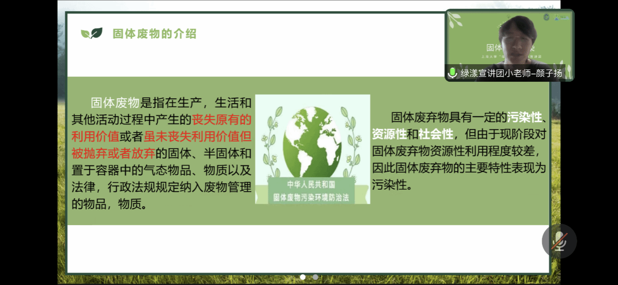 紧接着,讲师颜子扬向同学们介绍了固体废物资源化处理方法,固体废弃物资源化综合利用就是将固体废弃物中有用的物质及能量进行回收和再利用,达到污染防治的作用。