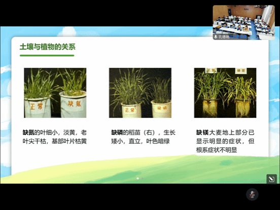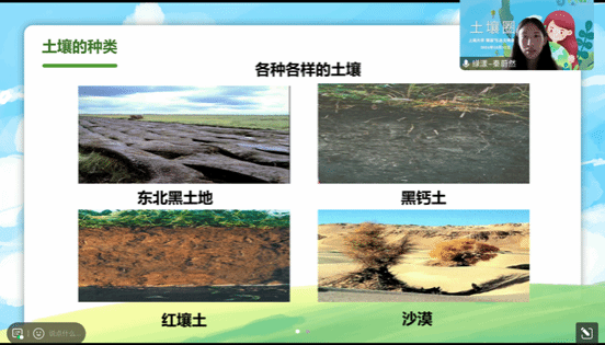 课堂开始讲师通过图文视频给同学们展示了一些常见的土壤类型,并提出思考问题:土壤是由什么组成的,陆生植物为什么离不开土壤?通过引导学生思考的方式,介绍了土壤的结构、组成和分类。