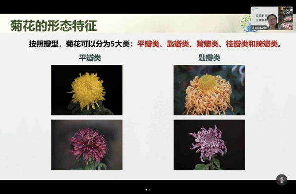讲师先介绍了动植物的分类方式,再通过动植物图片与名称向小朋友们展示了一些常见的动植物及其种类。接着从菊花的形态特征、生长习性和菊花的价值为小朋友们详细的介绍了菊花。