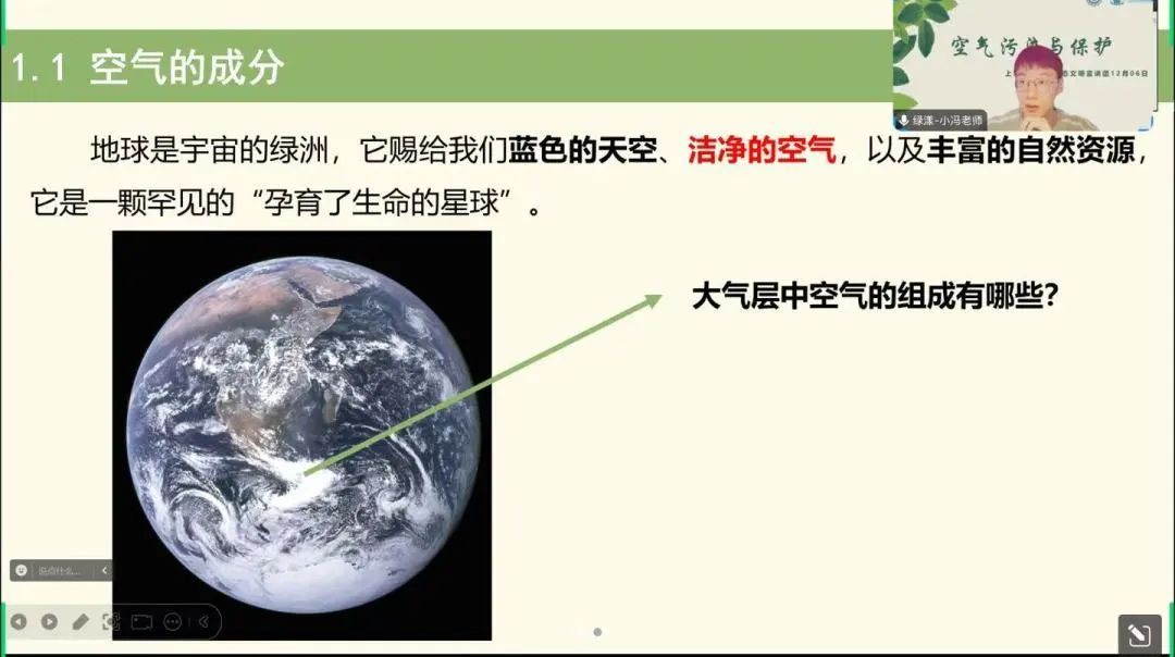 首先,讲师通过一张地球的图片导入课堂,并发出提问:“大气中空气的组成有哪些?”,引发同学们对知识的渴望。同学们积极举手回答问题,活跃了课堂氛围,为下面课堂的顺利进行打下了基础。