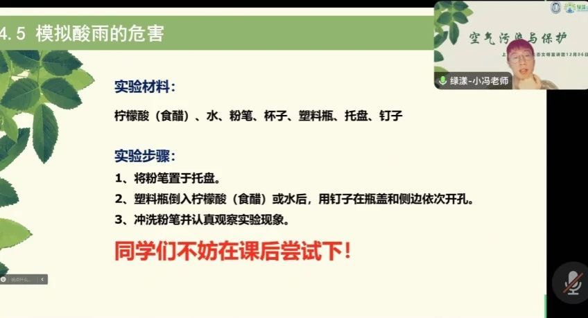 紧接着,讲师以人为因素中的汽车尾气问题为引,让同学们思考:“汽车尾气中的有害成分有哪些?”由此引出大气污染的危害。讲师接着对酸雨、可吸入颗粒物、温室效应、臭氧层空洞等大气污染问题展开了详细介绍。为了让同学们对大气污染危害有更深刻的了解,讲师介绍了一种模拟酸雨危害的实验方法,鼓励同学们课下动手模拟,加强对大气污染的认识。