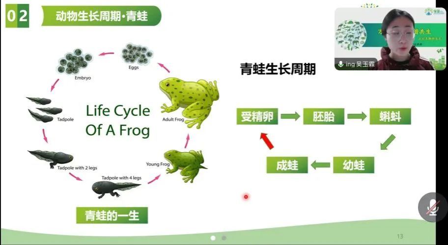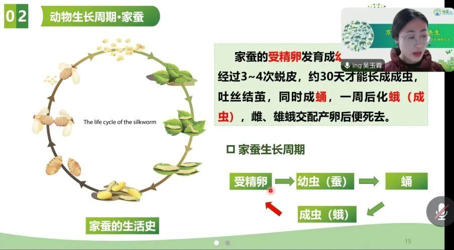 讲师以青蛙和家蚕的生长周期为例——都是从受精卵开始发育,最后发育成蛙(蚕),形象地讲述了动物的整个生长周期。从生活中常见的小动物引入,让小朋友们更直观地感受到完整的生长过程,更好地理解生物生长。