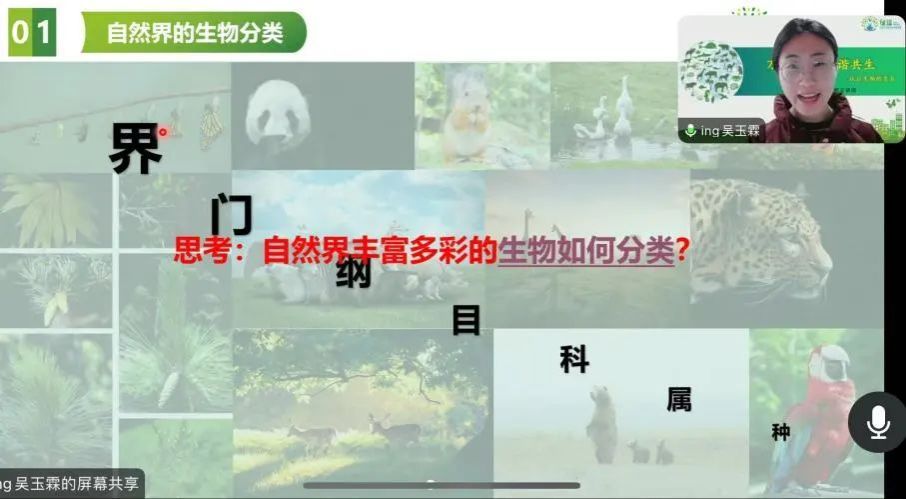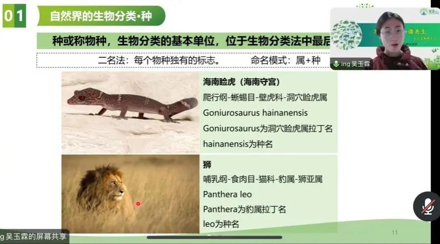 讲师首先介绍生物分类方式,从种、属、科、目、纲、门、界方式从小到大排列,用海南脸虎和狮子举例说明生物应该如何命名,让小朋友们可以快速地从例子中理解并掌握生物分类方式,加深对生物分类的印象。
