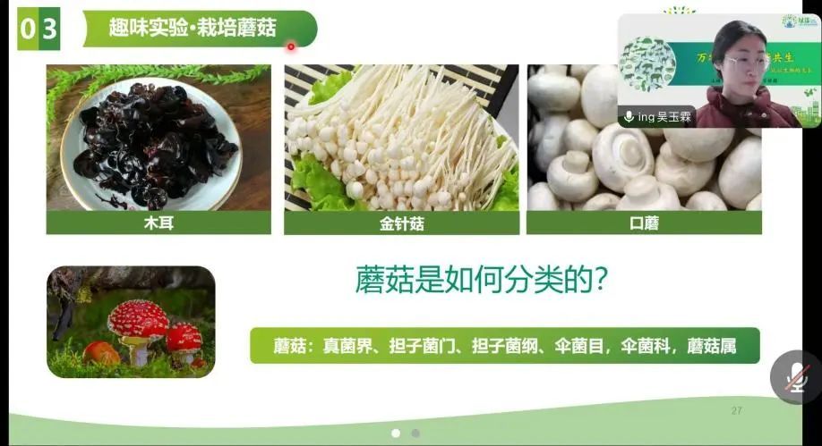 讲师讲解了生命生长所需要的条件——阳光、温度、氧气、稳定的生存条件等,讲师也提出生物存在多样性,其所需要的生长条件都不相同,因此生物多样性决定了生物适宜生存的环境存在差异,丰富了孩子们对生物和谐共生的理解,让孩子们知道不要去随意破坏其他小动物、植物的生存环境。之后,讲师通过一个趣味实验——栽培蘑菇来给小朋友们重新回顾生物的分类方式、生长周期、所需生长条件,让孩子们更加直观地感受生物生长。