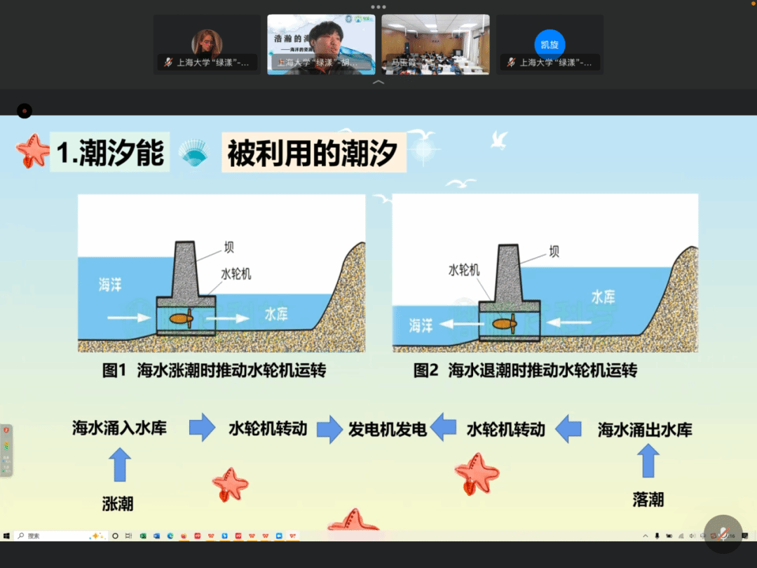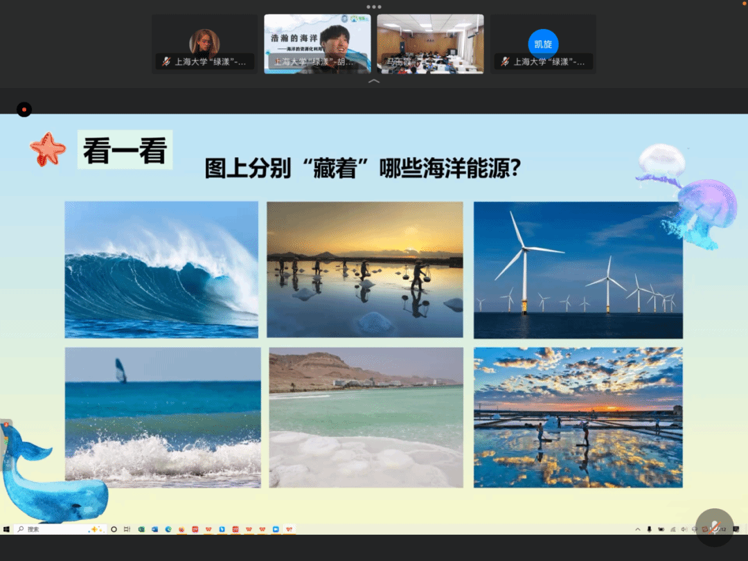 接着,讲师围绕海洋能源如何进行高效的资源化利用进行讲解,用“海水为什么是咸?”这一问题引入,以及介绍涨潮退潮推动水轮机转动的基本原理等,由浅入深地讲解了潮汐能、潮流能和波浪能、海洋风能、盐差能、温差能等多种海洋能源。不仅阐述了这些能源产生的原因,还介绍了人类对这些能源的开发利用,让同学们理解海洋能源的资源化利用的可行性与重要性。