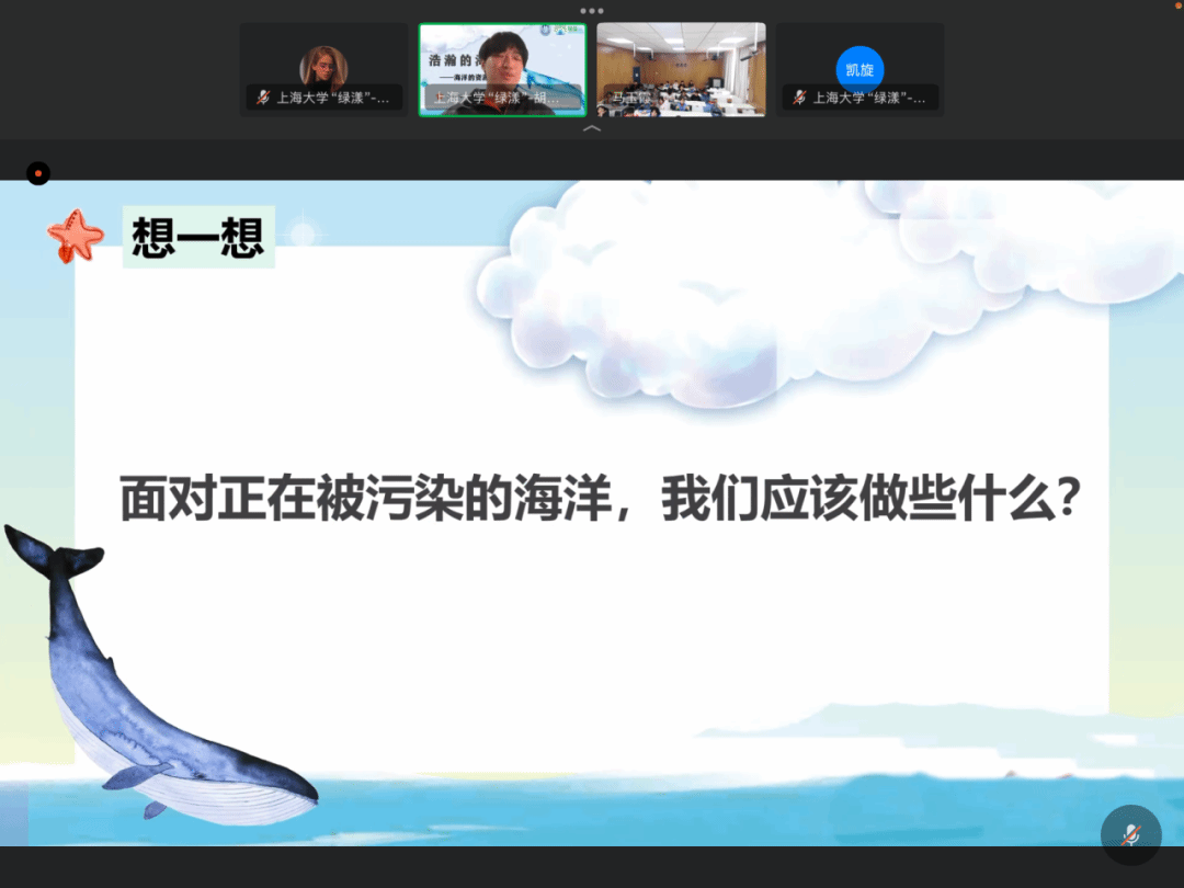 我很荣幸能作为一名讲师给小朋友们科普海洋资源化利用的知识。虽然我们远隔千里,但在课堂上我仍能感受到小朋友们对于新知识的渴望。通过这次宣讲,小朋友们的环保意识有了进一步的提升,在课堂最后纷纷提出了自己对于环保的建议。这次宣讲让我意识到,环保并非宏大的口号,而是藏在生活的一件件小事之中。在未来我也将继续发扬“绿漾”精神,为公益事业贡献力量。