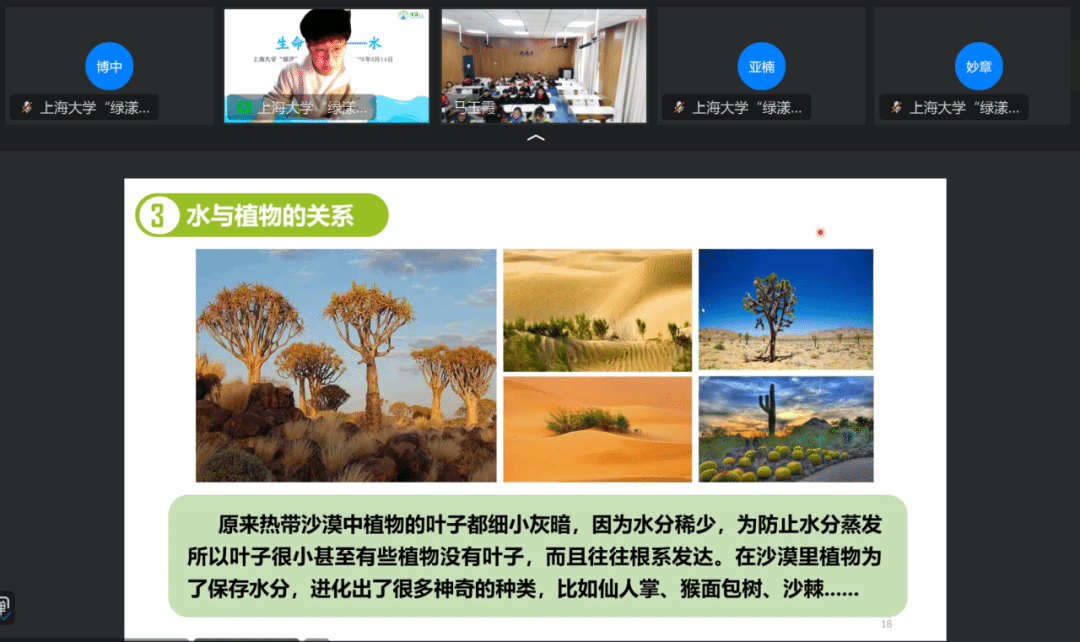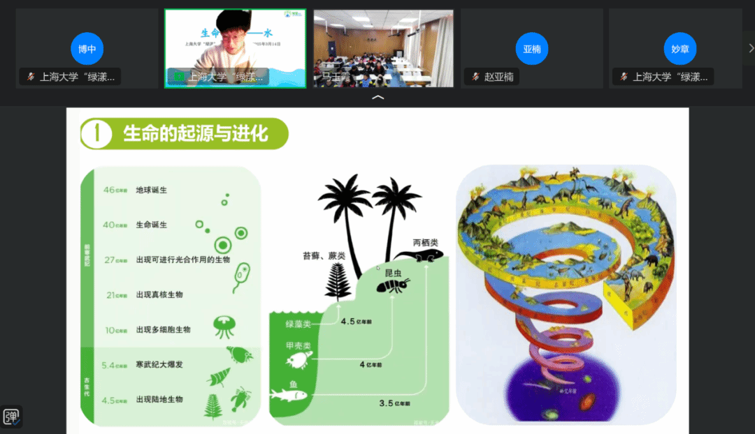 随后,讲师借助视频和图画生动地呈现了水在生物进化中的重要作用,极大地提升了课堂的趣味性,也将课堂氛围推向了高潮。同学们热情高涨,积极分享自己的观点以及身边的相关案例,使得课堂气氛异常活跃。