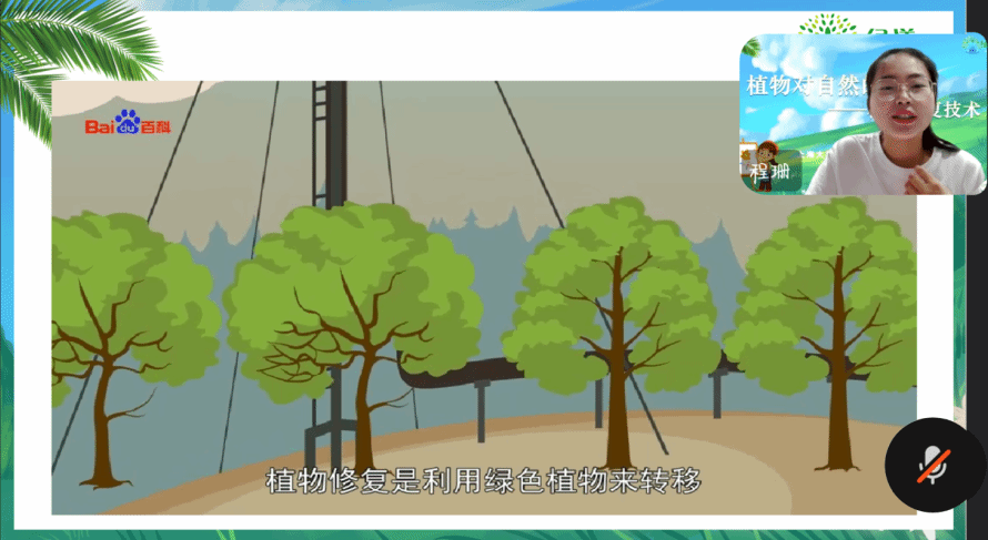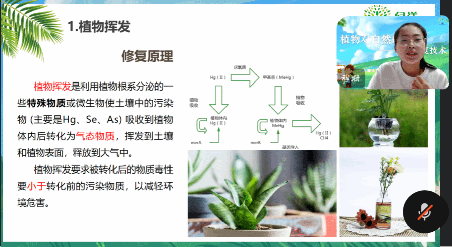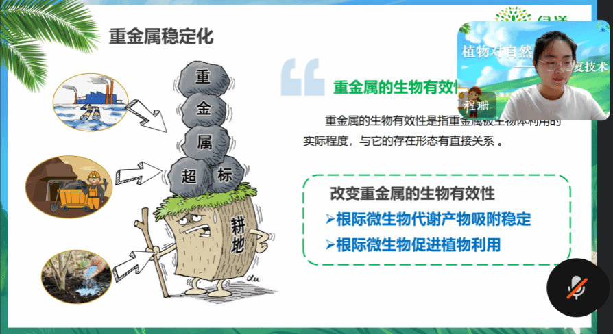 随后,讲师通过“植物‘吃’掉的有害物质对自身有影响吗”这一问题,引起了同学们对植物修复技术原理的好奇心。讲师接着对植物修复的过程、影响植物修复的因素等展开了详细介绍。为了让同学们对植物修复技术有更深刻的了解,讲师还展示了一段植物净化污染物的视频,加强同学们对植物修复技术的认识。