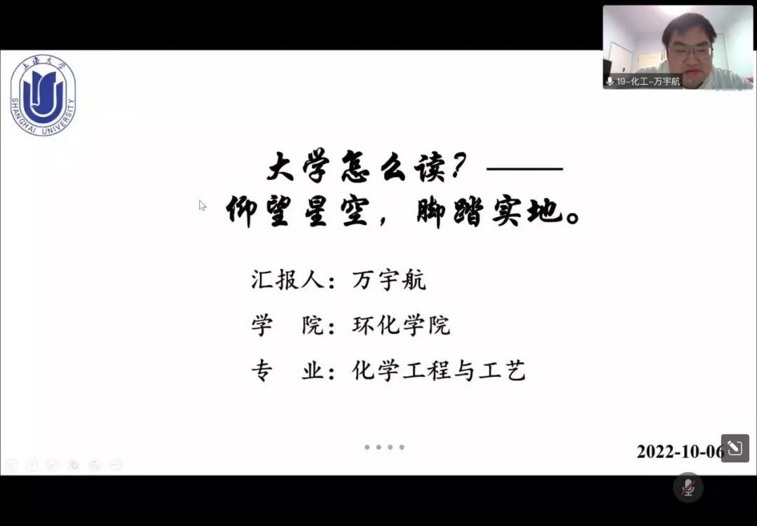 万宇航学长以“脚踏实地,仰望星空”为题展开分享,谈及自己在大一时对大学生活还没有足够的认识,没能及时适应,因此虚度了时光,很多事情没有达到预期。他认为大学的目的是提升自己、增长阅历,通过亲身经历介绍了他的大学主线。