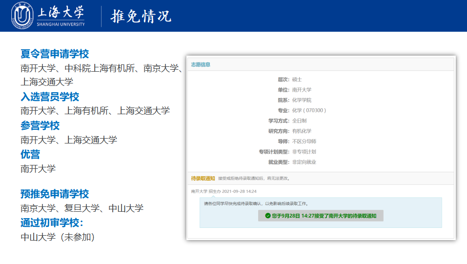推免至南开大学的路战胜学长从绩点、竞赛、志愿者、院校选择、政策解读等方面为大家做了详细的介绍。由于绩点占遴选指标的75%,他建议大家在日常学习中要在学分较大的科目上多花些时间。加分政策主要涉及有入伍服兵役、志愿者、国际组织实习和科研竞赛,但每个人的精力有限,学长鼓励大家要在课余时间积极参与各类志愿者活动,同时平衡好学业和竞赛之间的关系、量力而行。在一些重要时间节点方面,要经常关注目标院校的研招网与学院网站,把握好7月参加夏令营、9月中上旬各大院校预推免系统开放、9月28日填报志愿等节点,特别是要抓住前两个时间段进行申请。此外,路战胜学长还推荐了保研人、保研论坛等公众号,并结合个人实际经历分享了如何准备夏令营面试。
