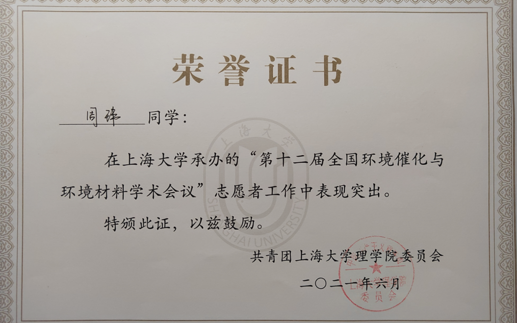她热爱集体,积极参加志愿者活动,如:参加第十二届全国环境催化与环境材料学术会议并获得优秀志愿者称号。参与公寓楼的安全管理,担任安全委员一职,协助宿管阿姨完成公寓楼的安全检查。