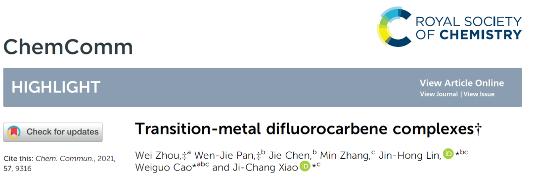 [1]Zhou Wei et al. Transition-metal difluorocarbene complexes.[J]. Chemical communications (Cambridge, England), 2021, 57(74) : 9316-9329.