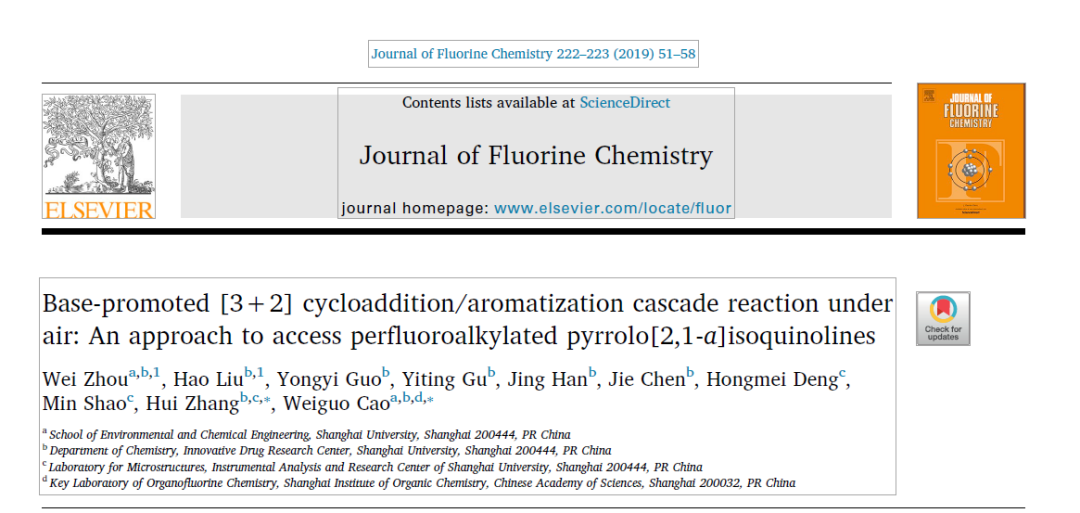 [2]Wei Zhou et al. Base-promoted [3+2] cycloaddition/aromatization cascade reaction under air: An approach to access perfluoroalkylated pyrrolo[2,1- a ]isoquinolines[J]. Journal of Fluorine Chemistry, 2019, 222-223 : 51-58.