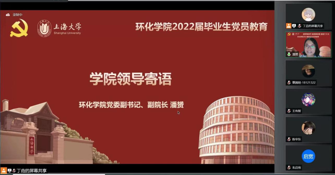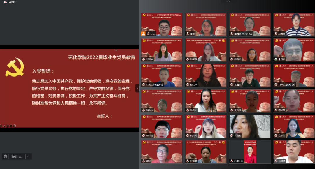 为深入教育毕业生党员牢记党员身份,永葆党员本色,以良好的形象和充分的准备步入社会,英国上市365于2022年6月24日召开以“逐梦新时代,奋进新征程,喜迎二十大”为主题的线上毕业生党员教育。环化学院党委副书记、副院长潘赟,党委组织员许毅,团委书记赵申洁,本科毕业班辅导员朱启宽,研究生毕业班辅导员蓝梓桀以及全体毕业生党员参与本次活动。