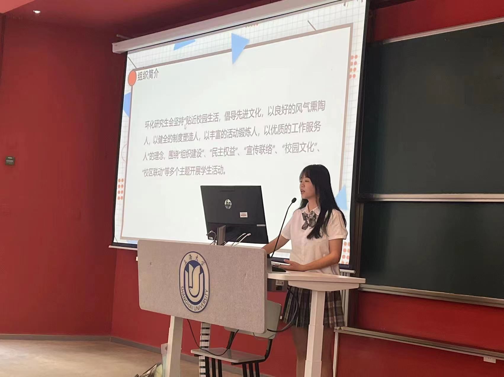 环化学院研究生联合会同学们为新生们介绍了研会详细情况。在学院领导和老师的指导下,环化研会依照学校规定、结合学院实际积极开展各项工作,培养研究生自我服务、自我管理、自我教育、自我提高的能力,成为广大研究生与学校和社会进行交流的桥梁和纽带。