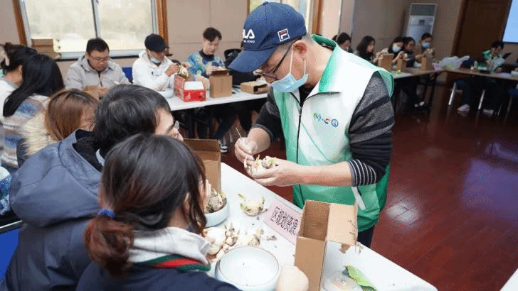 座谈活动结束后,与会者共同参与了环保绿植手工活动——雕刻水仙,为本次座谈交流增添了趣味和互动性。区生态环境局特邀了长风公园的水仙雕刻老师进行现场教学,让大家在轻松愉快的氛围中学习新的手工技能。