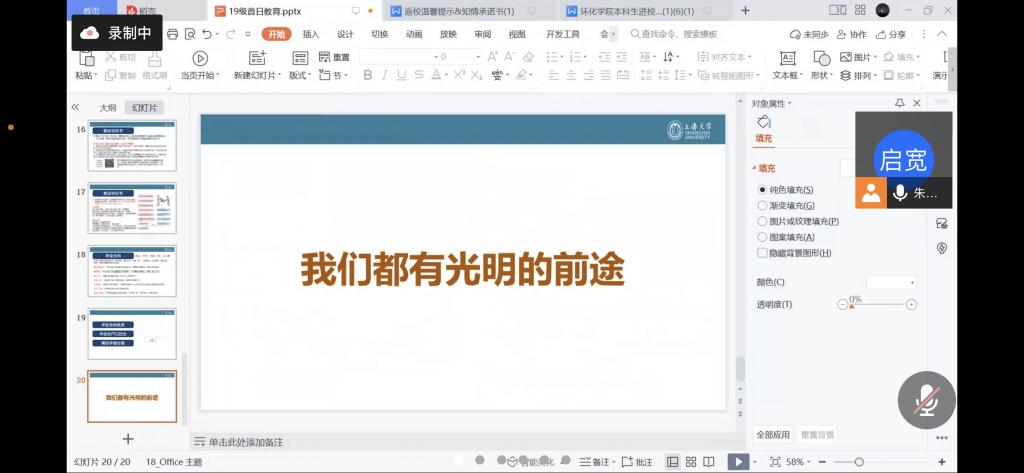 20级学子在线上进行大会。会议首先进行了两个专业的团推优,几位候选人赤诚发言,表达了拥护党组织、积极入党的心。随后辅导员赵申洁老师对校园疫情防控事项进行了详细的解答。
