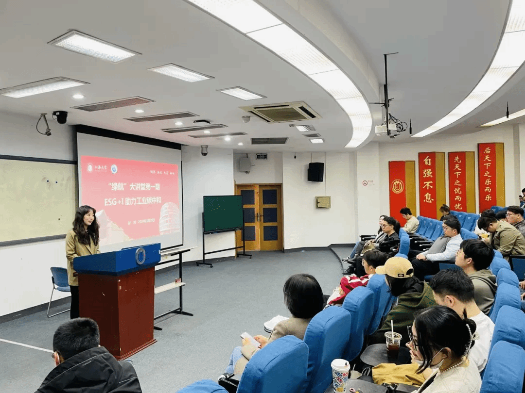 3月29日下午,由我院“绿航”生涯规划指导工作室举办的“绿航”大讲堂第一期:从“ESG+I 助力工业碳中和”讲座分享会在宝山校区J102顺利举行!此次活动邀请了环化学院党委副书记、副院长潘赟,上海市产业发展研究和评估中心主任助理兼绿色智造部经理王春雷、人力行政总监吴陈俪、业务经理肖可心,环化学院就业中心主管、“绿航”生涯规划指导工作室负责人、研究生辅导员潘辰苑以及本科生辅导员、党支部书记朱启宽。本次活动由2023级研究生张诗婉主持。