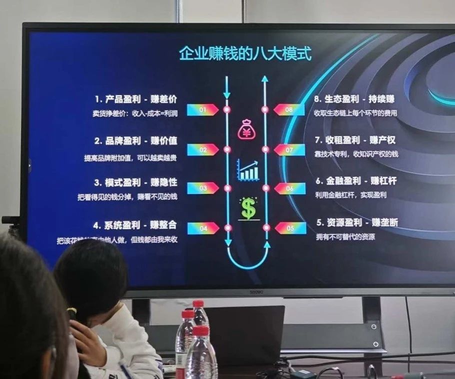 活动伊始,张教练和同学们探讨了“钱”在人生中的地位这一问题,以此来了解同学们对于“金钱”和“赚钱”这两个基本概念的认知和期望。接着,张教练向同学们简单介绍了企业赚钱的八大模式,并通过一些实例让同学们进一步了解了这些赚钱模式,打开了同学们花式赚钱的思路。