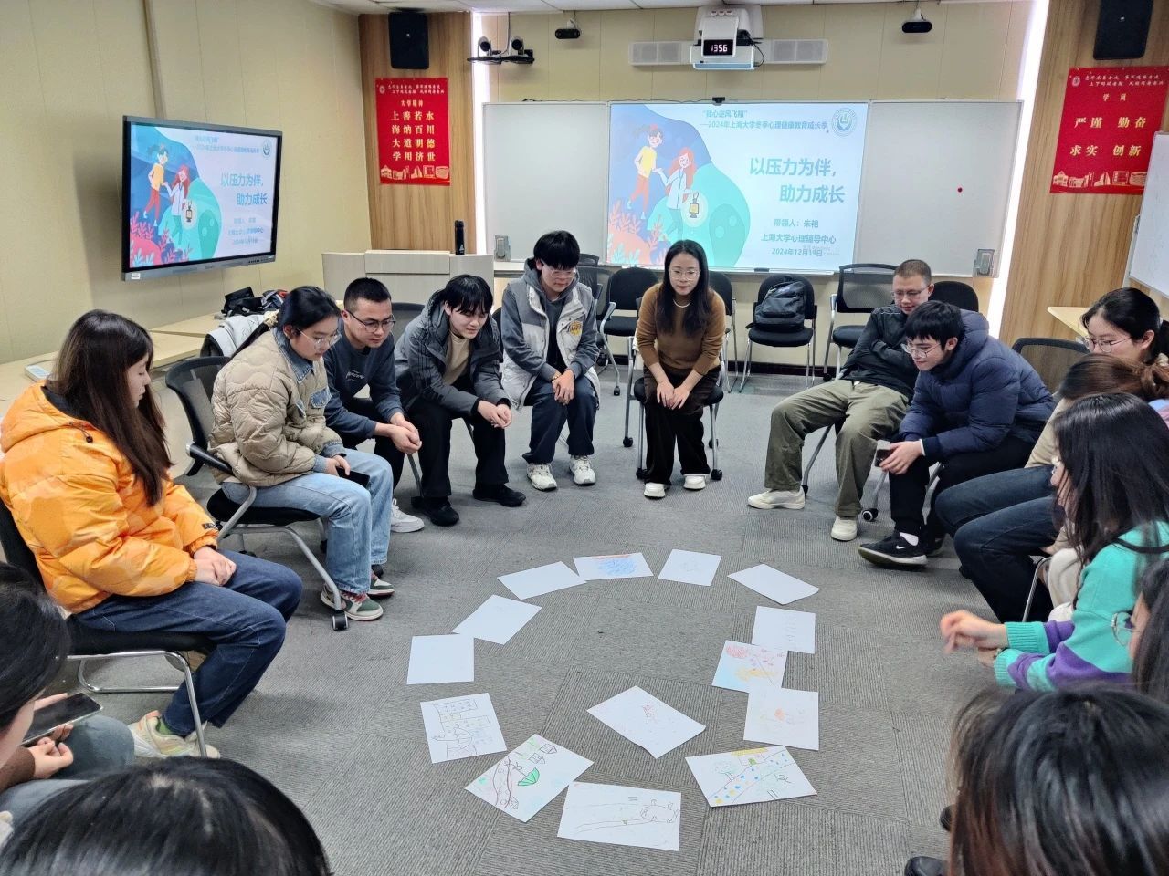 朱老师指出,这些涂鸦不仅仅是艺术创作,更是一种压力测量的独特方式,雨点的大小、雨点的密集程度反映近期所感受到的压力,而所画出辅助物例如雨伞、房子等可以看作是应对压力的方式或资源。同学们借此机会进一步联系近期自身状态进行深度思考,对压力有了更为直观和深刻的认识。