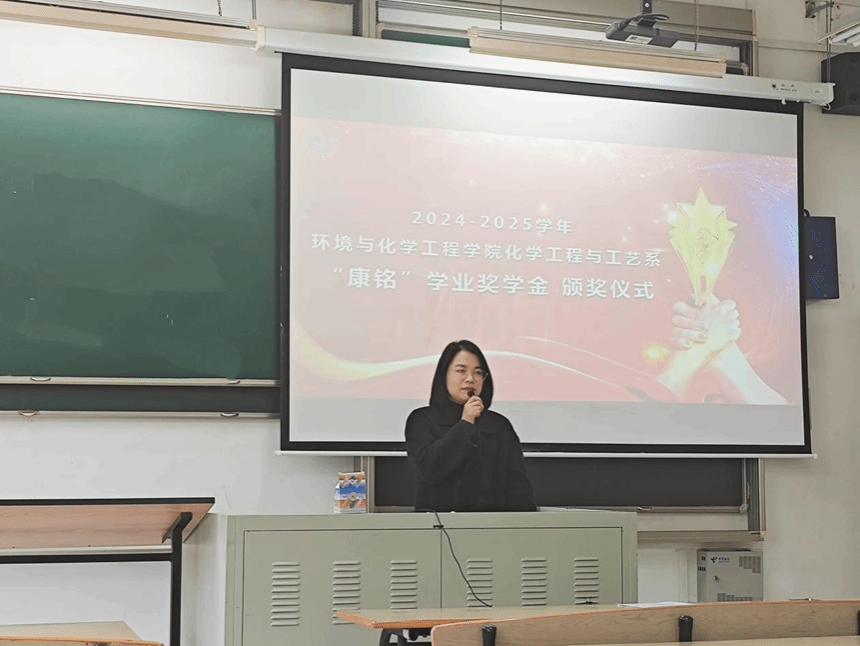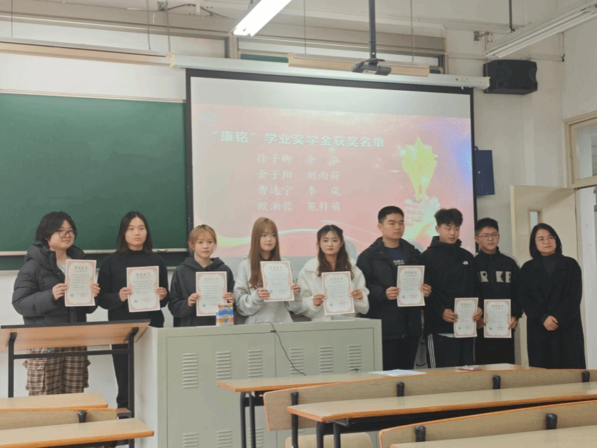 随后,由环化学院党委副书记、副院长潘赟老师为班级里在秋、冬两学期成绩优秀的8位同学,颁发“康铭”学业奖学金。